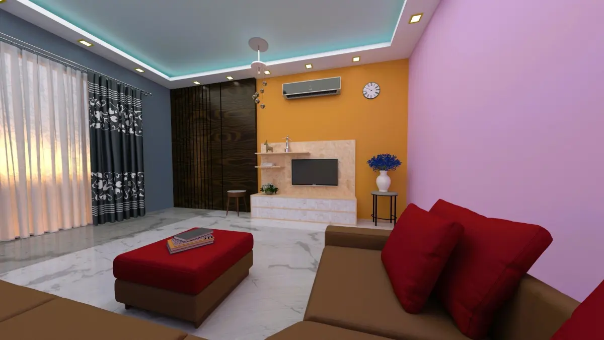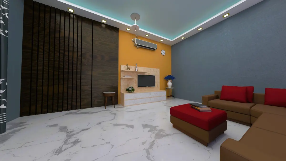 The 3D living room model features a modern design with a cozy sofa, sleek coffee table, warm tones, and textured walls. Ambient lighting and large windows enhance its bright, inviting atmosphere, complemented by stylish decor and natural elements.