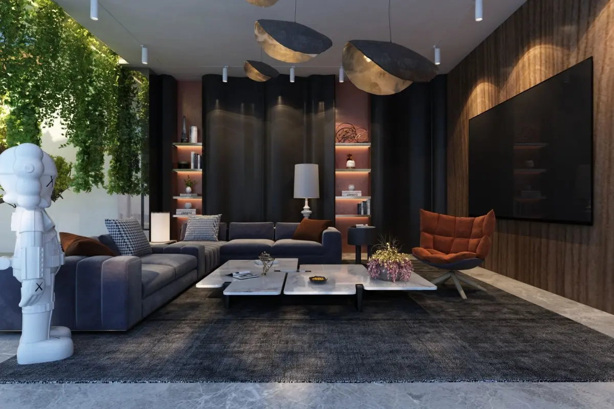 Living room , modern luxurious living room , rustic hanging light , cartoon 3d model , creepers