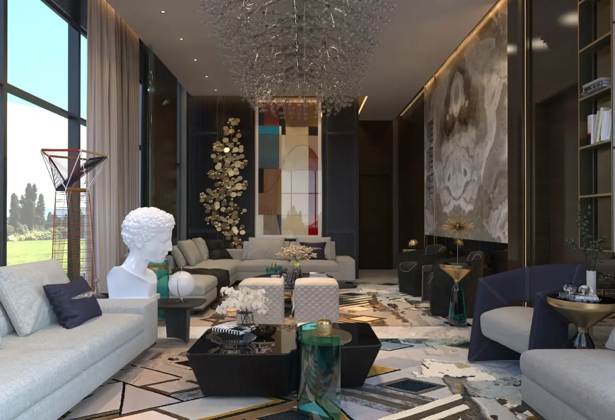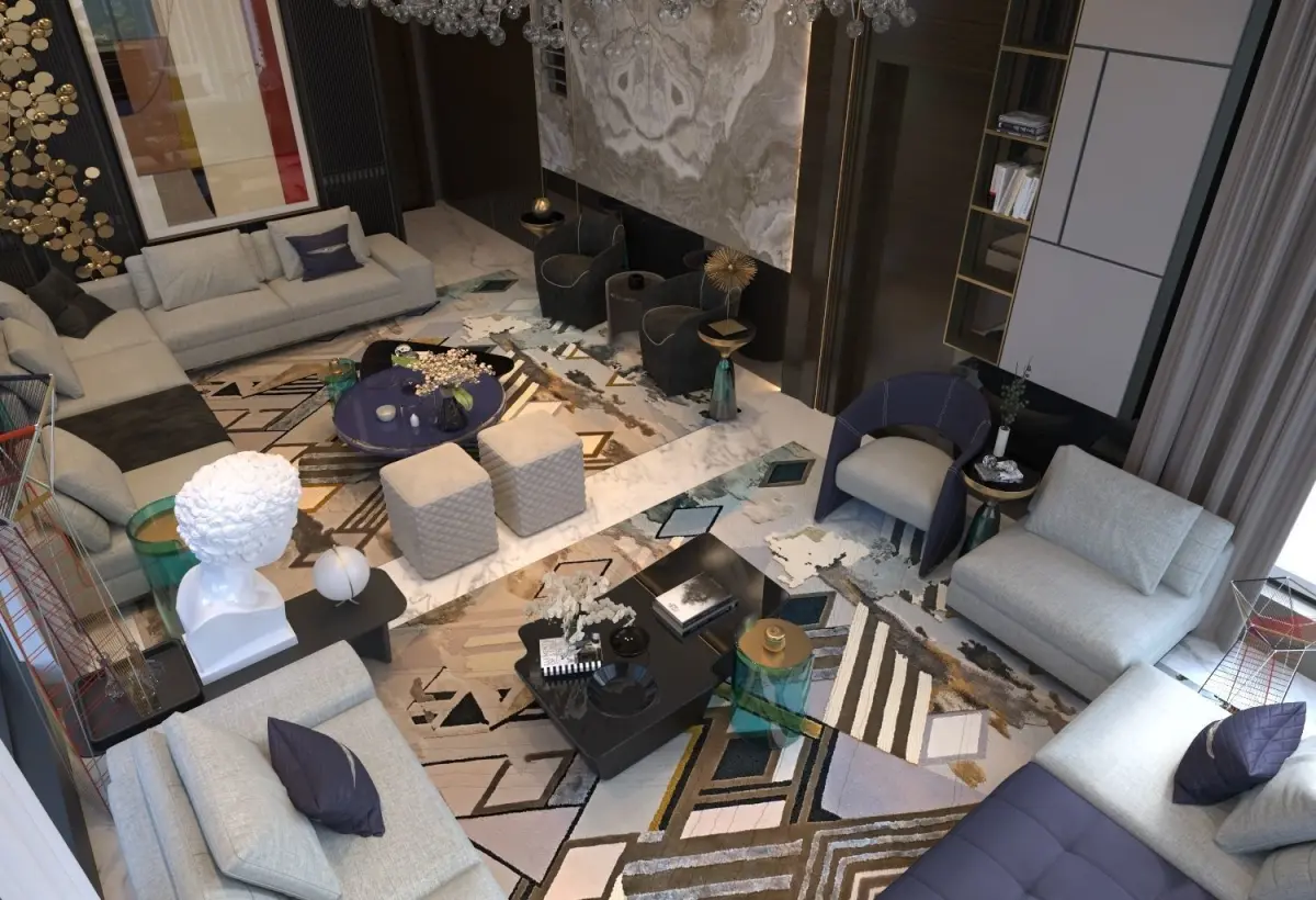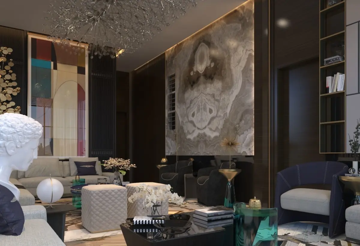 Luxury Design for living room ( 3DSMAX 2019 modeling and V-RAY 5) , all the material and texture and light setting in zip. filemixed wood panels with art frame and bookmatch marble , two sitting zone with Ushape and L shape sofapolys 11,839,314verts 9,026,012