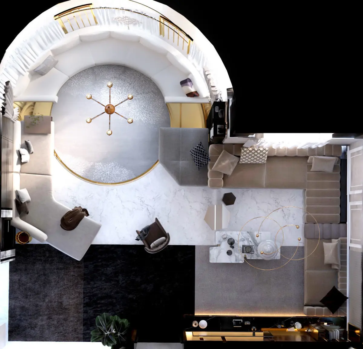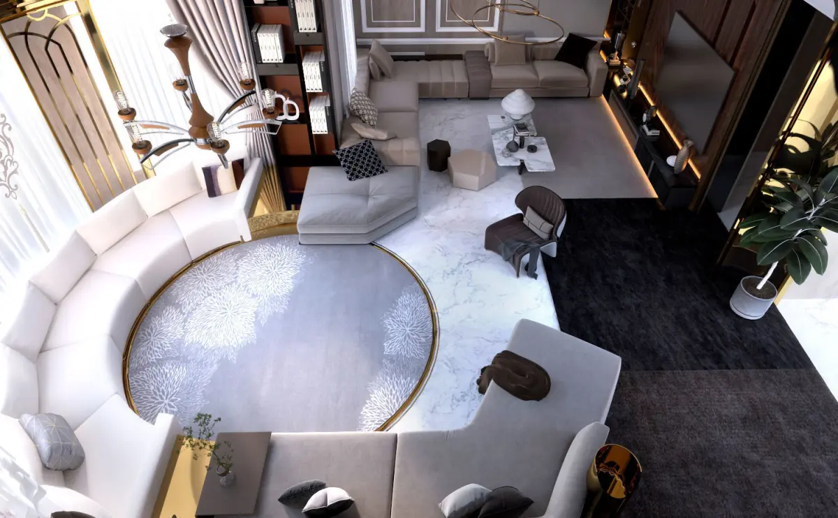 Luxury Design for living room ( 3DSMAX 2019 modeling and V-RAY 5) , all the material and texture and light setting in zip. file mixed wood panels with art frame and bookmatch marble , two sitting zone with Ushape and L shape sofa