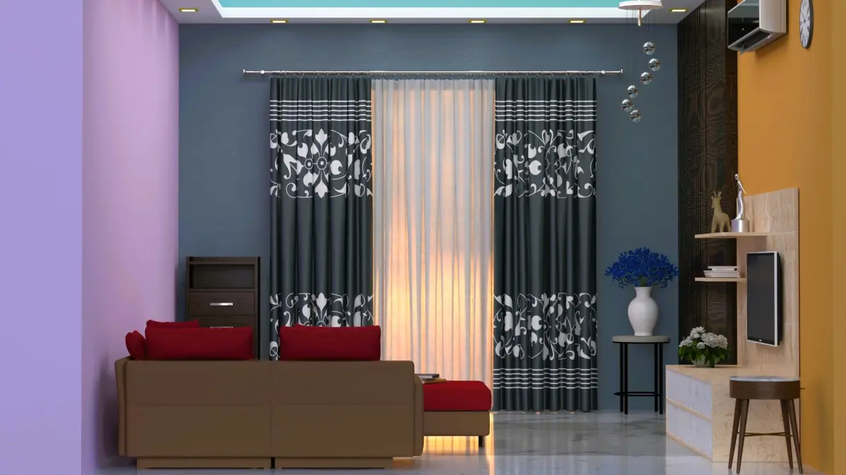The 3D living room model features a modern design with a cozy sofa, sleek coffee table, warm tones, and textured walls. Ambient lighting and large windows enhance its bright, inviting atmosphere, complemented by stylish decor and natural elements.