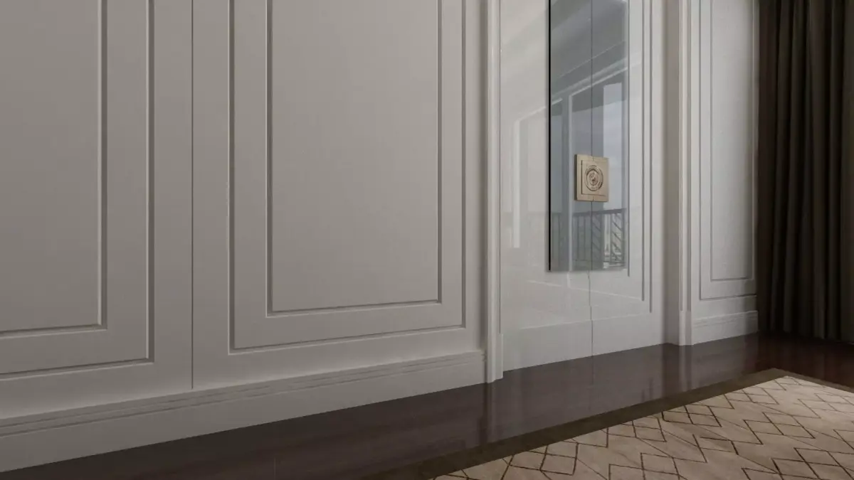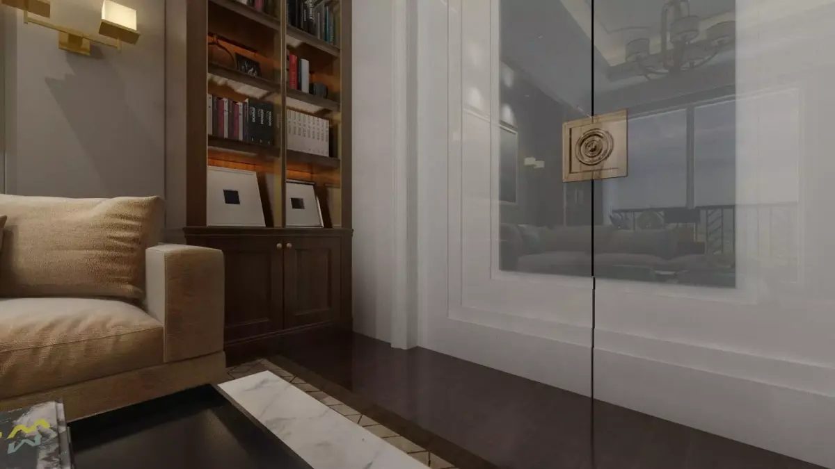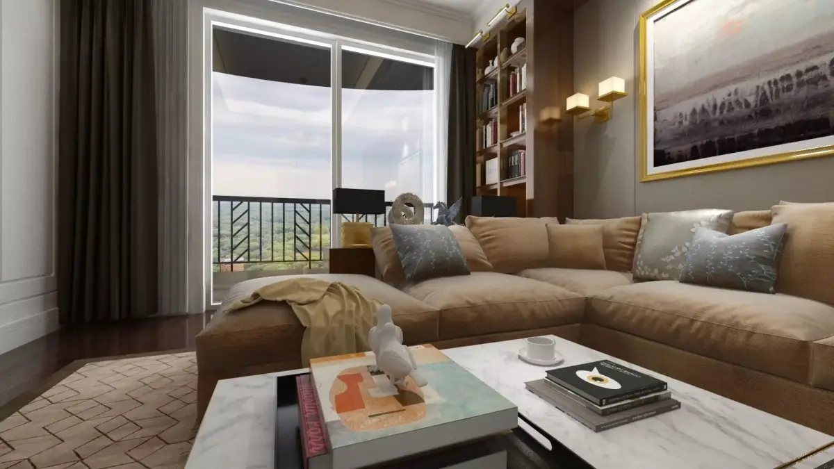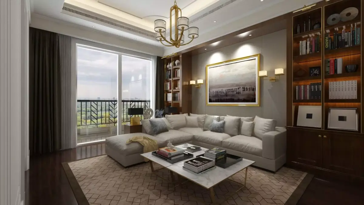 Interior scene of a fully furnished and decorated living room in Empire style with simple balcony.