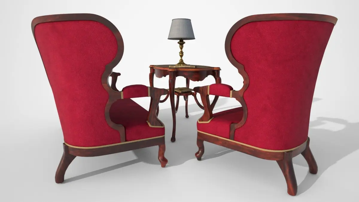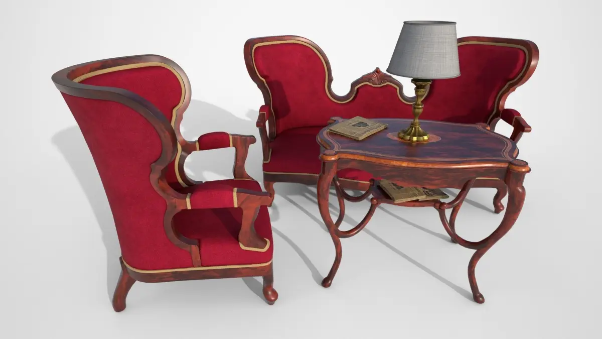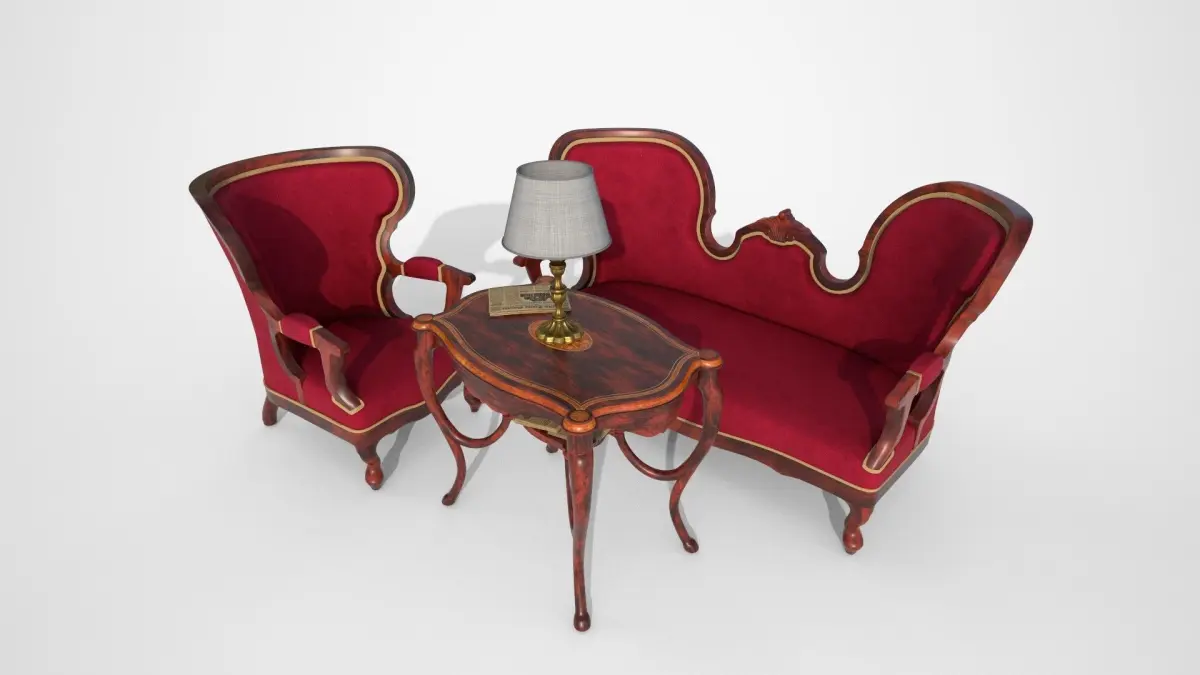 Gothic furniture set for living room. Contains Gothic armchair and sofa with decent decorations. As a material, we chose dark acacia wood to highlight the decorations and velvet on the seating area. The model fits perfectly into any living room of the late 19th century. The table is decorated with a distinctive carving in the middle of the board The model fits perfectly into any living room of the late 19th century. Of course, newspapers cannot be missing. And why the newspapers? Because there is no better feeling than read about the completion of your own house in the newspaper. You can also find here a lamp for the darkest night.