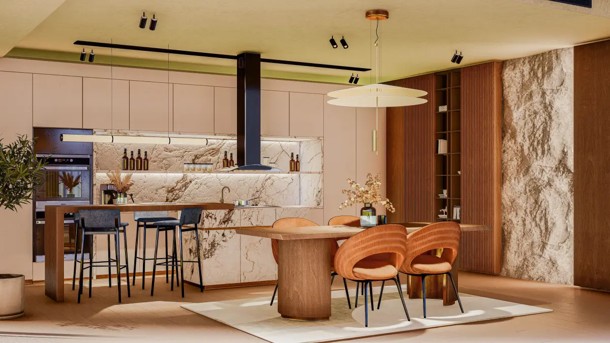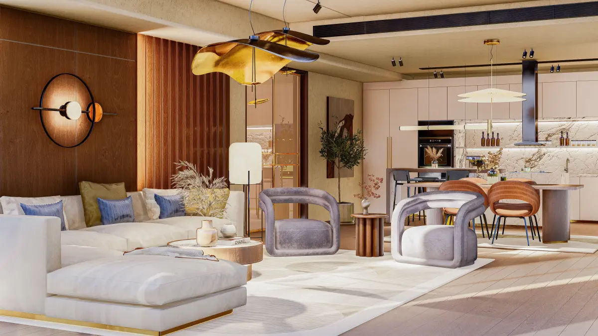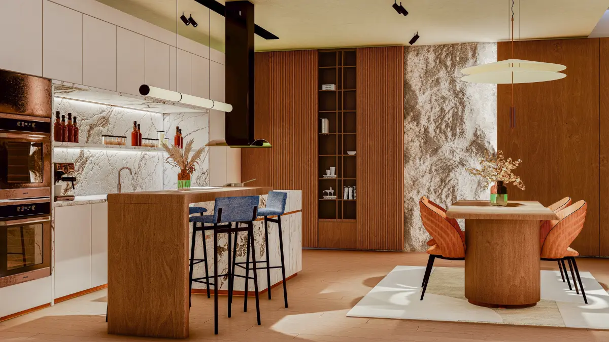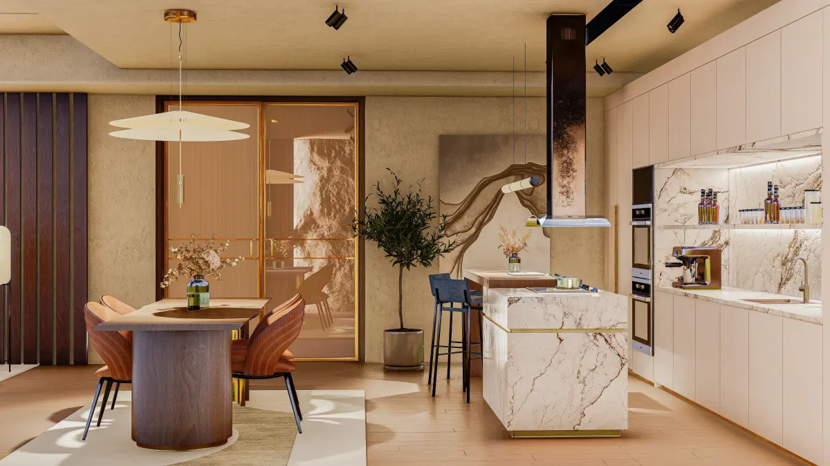 un impresionante modelo 3D de un apartamento de lujo que incluye una lujosa cocina, un sofisticado comedor y una cautivadora sala de estar. Meticulosamente diseñada y renderizada con Lumion en el pináculo de la calidad, esta obra maestra virtual da vida a una sensación incomparable de elegancia y grandeza.