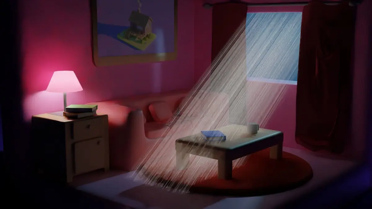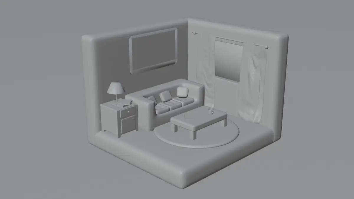 Low polt living room with pink coloring and soft models. Also with artistic lighting. The light rays in the one image for just for showcasing it is not included in the model.