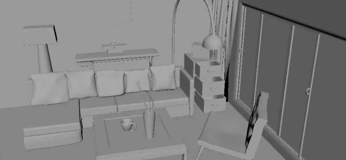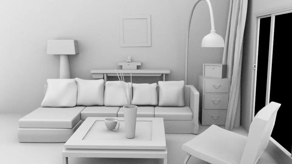Interior Living Room, Sofas & Couches, Glass Table, Drawers, cup, flowers, glass window, lamp, Chair. You can easly edit any model like any shape no any limits.