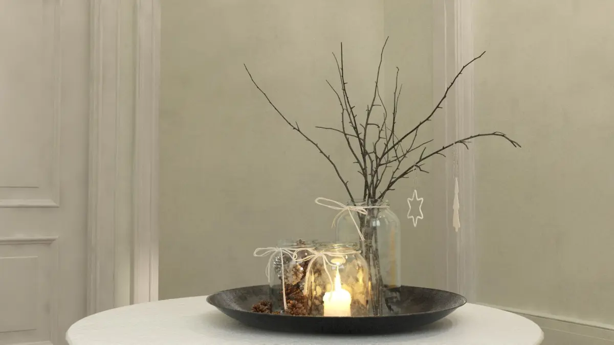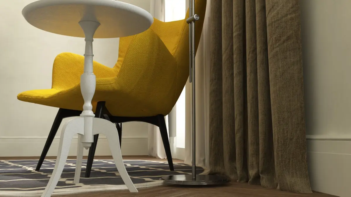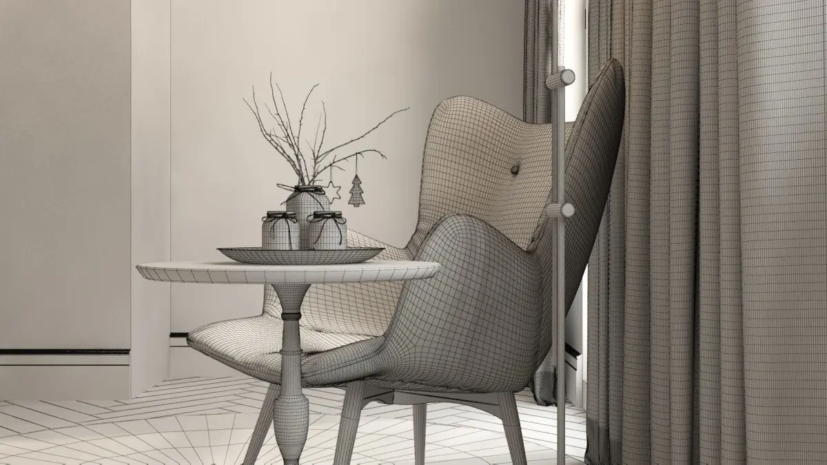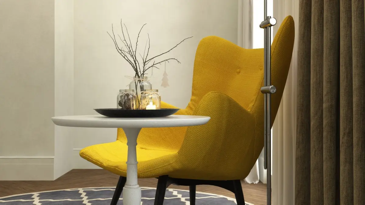 Living room set: armchair, lamp, coffee table with decoration(candle/pine cone/branches in glass). Background: window with curtains, door, baseboard.