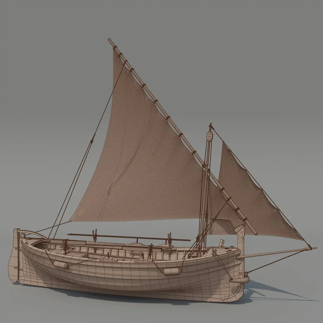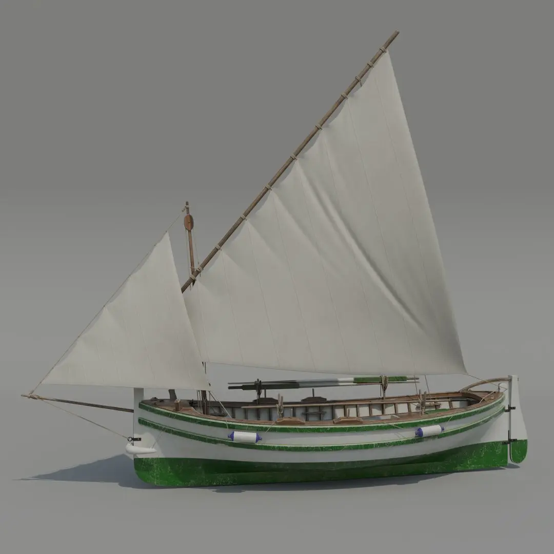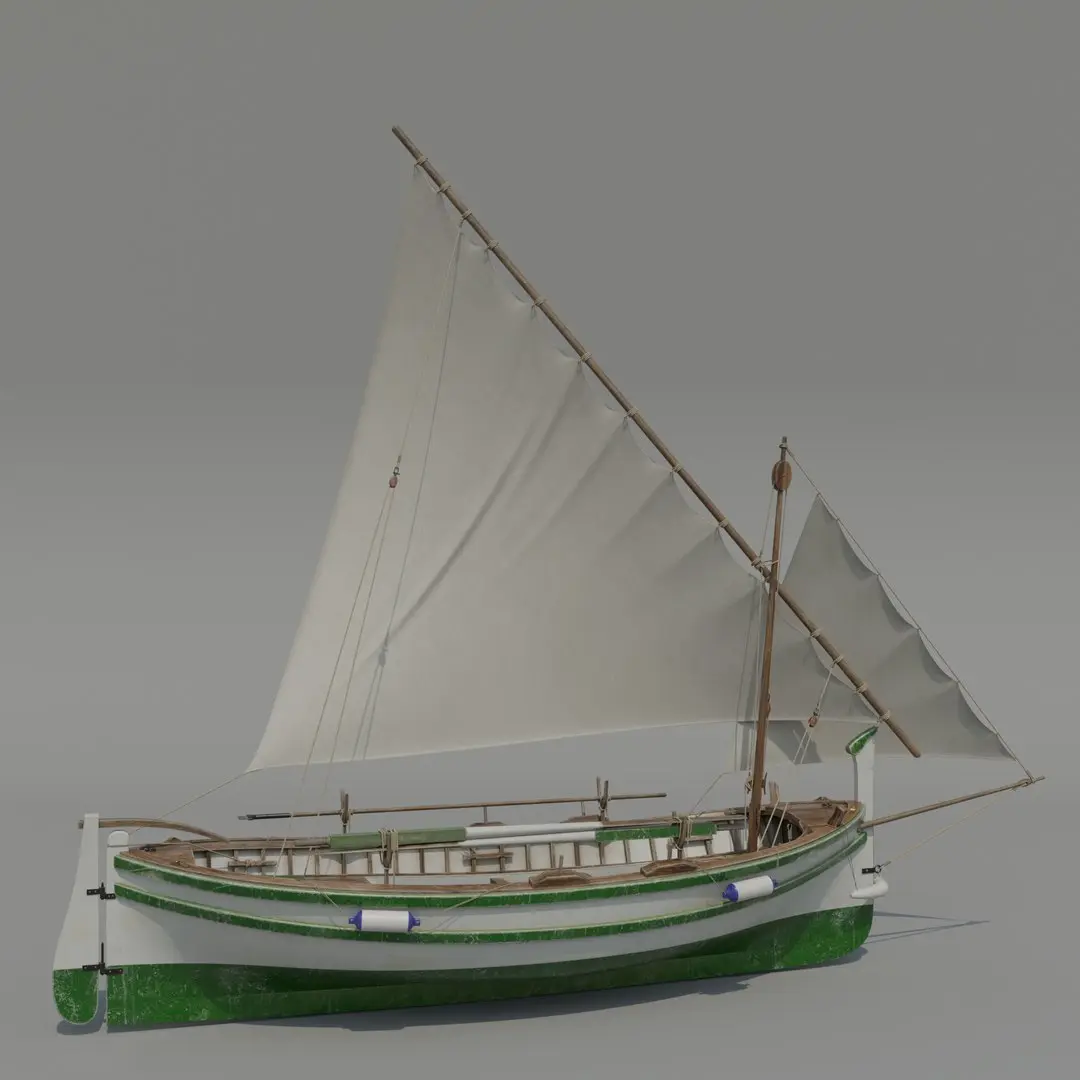 This is a high-quality 3D model of a traditional Llaut boat, a classic wooden sailing vessel commonly found in the Mediterranean. Historically used for fishing and coastal trading, the Llaut remains a popular choice for recreational sailing. This model features an authentic lateen sail configuration, reflecting traditional boatbuilding craftsmanship.