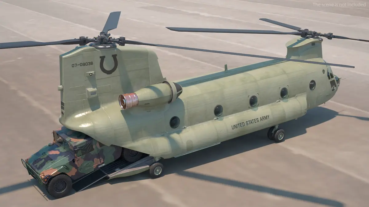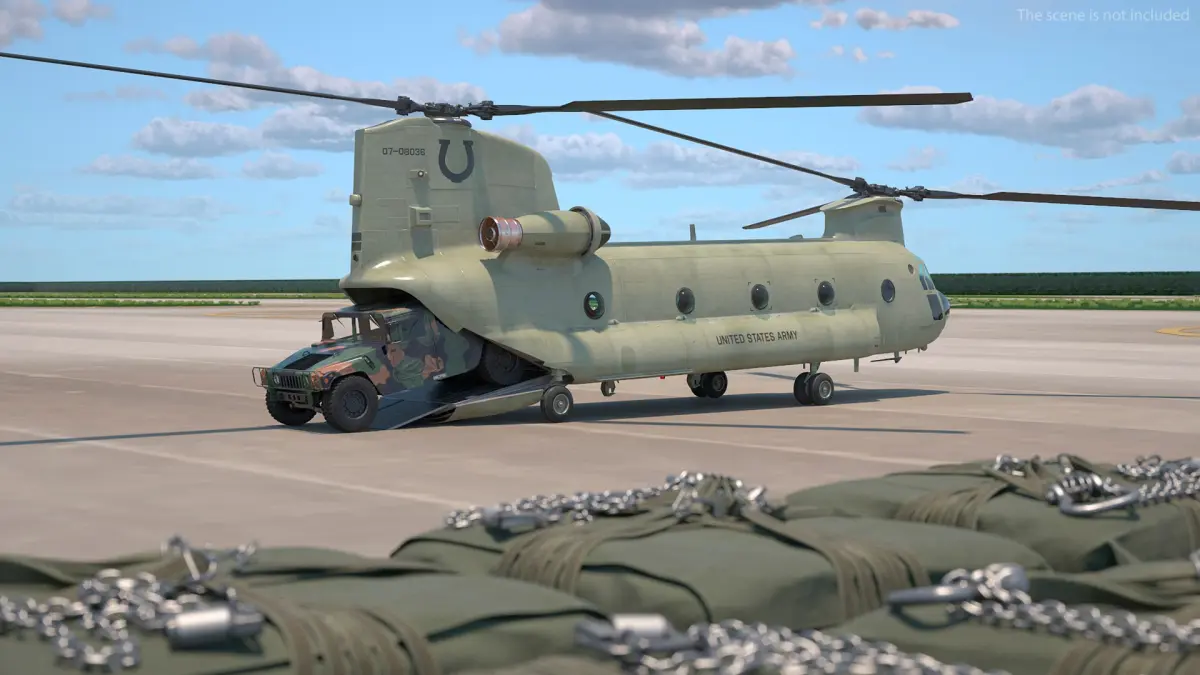 The model includes a highly detailed Humvee with features such as rugged tires, reinforced chassis, and military-grade equipment, alongside a realistic CH47 Chinook with an open cargo bay and loading ramp. The scene emphasizes precision and functionality, showcasing the integration of land and air transport systems. This model is designed for dynamic visualizations, with rigged components for enhanced animation and simulation purposes.