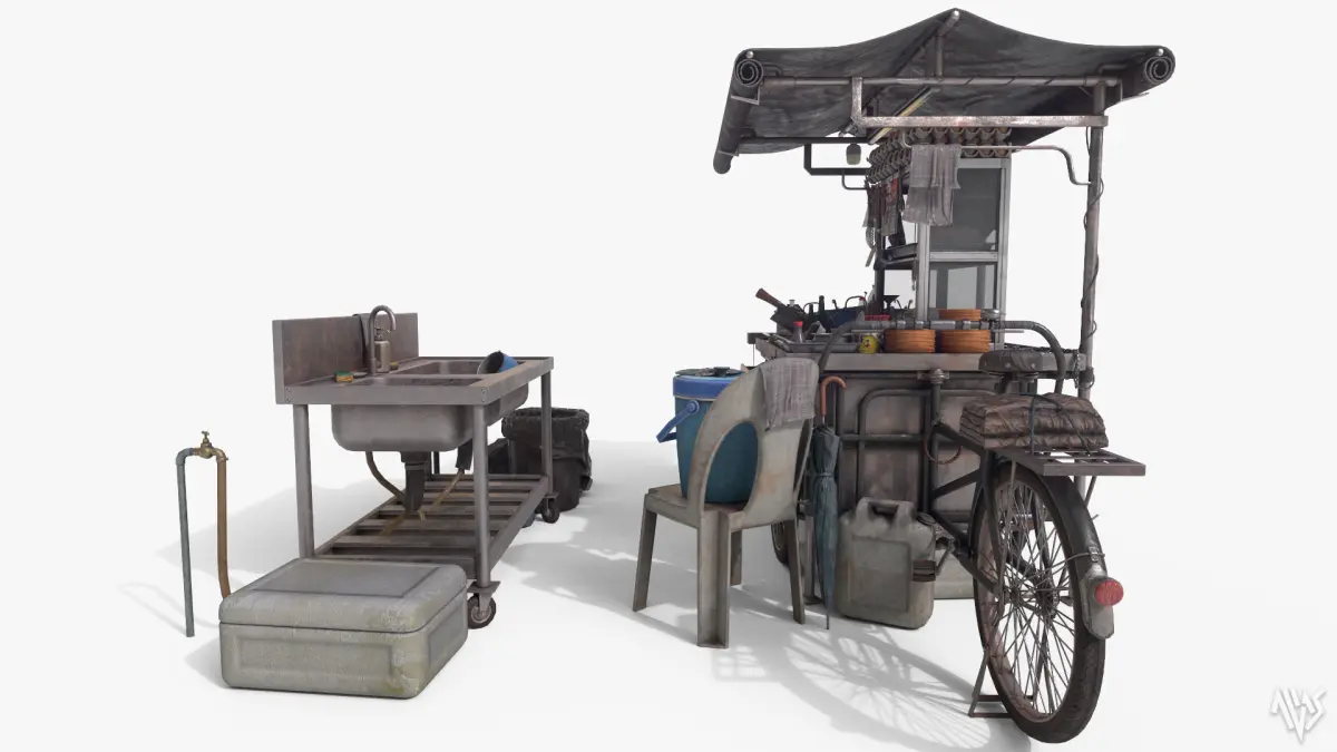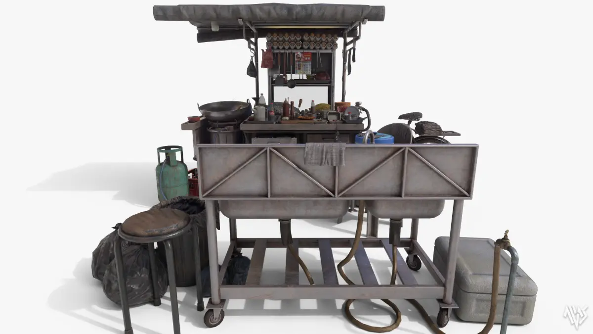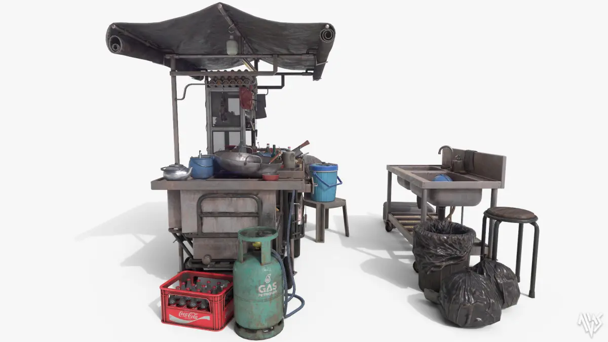 Local Char Kuey Teow Stall based on the Malaysian streetfood scene. Basically a roadside (sometimes foodcourt) hawker stall that sells freshly fried noodle and rice noodle typically seen around Penang region.Obj and fbx formats with 2 material sets and selections of 1k, 2k and 4k textures. The model is in midpoly suitable for nanite workflow. Also includes sets of textures with fake brand names to avoid licensing issues in the additional files.