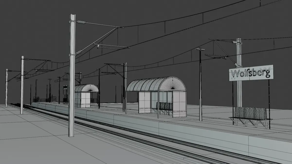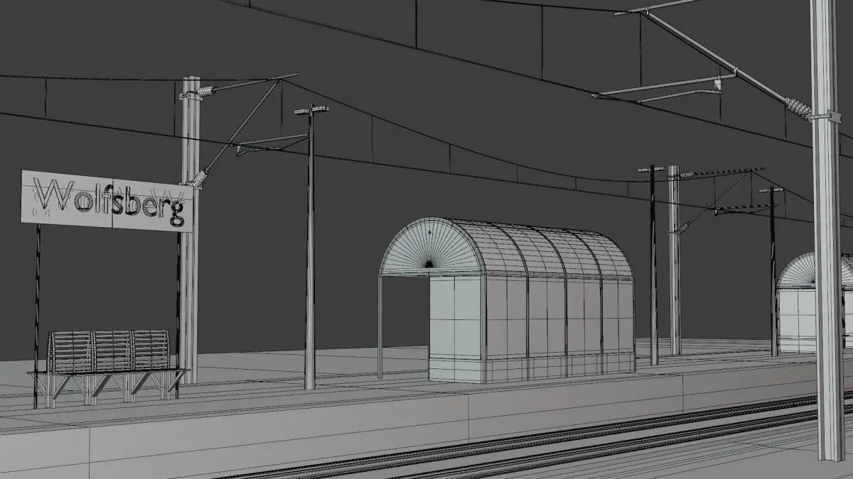- This is 3D model of local railway station with electrified tracks and pedestrian crossing.
