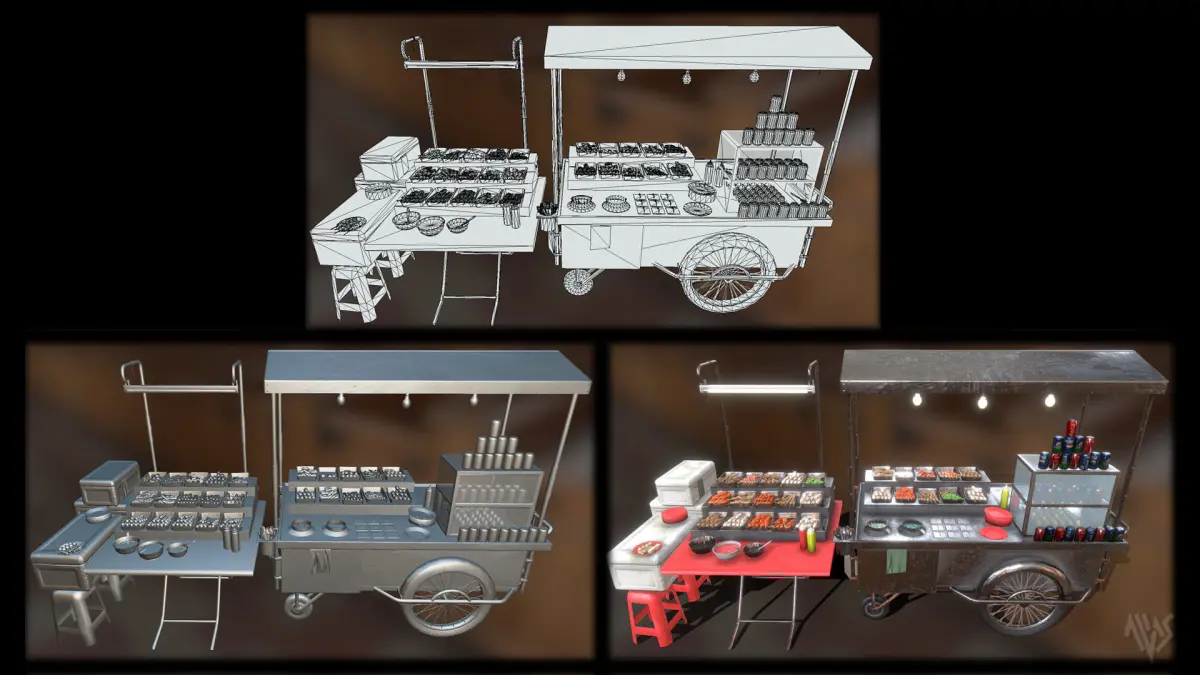 Street stall for a marketplace vendor. The design is based on local malaysian stall. Map includes base color, metal, roughness, normal, ao, opacity and emission. Additional file includes obj, fbx format and textures in 1k, 2k and 4k. https://www.artstation.com/artwork/Qzw5nr