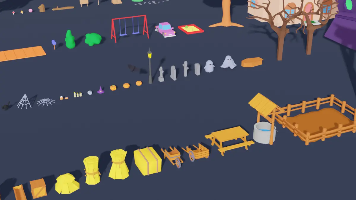 houses, villa, farm, scary house, vegetation, flowers, trees, bushes, vegetables, berries, barrels, tables, chairs, cars, corals, hay, nature, tools, pumpkins, ghosts, simpsons, gravity falls, crusty crabs
