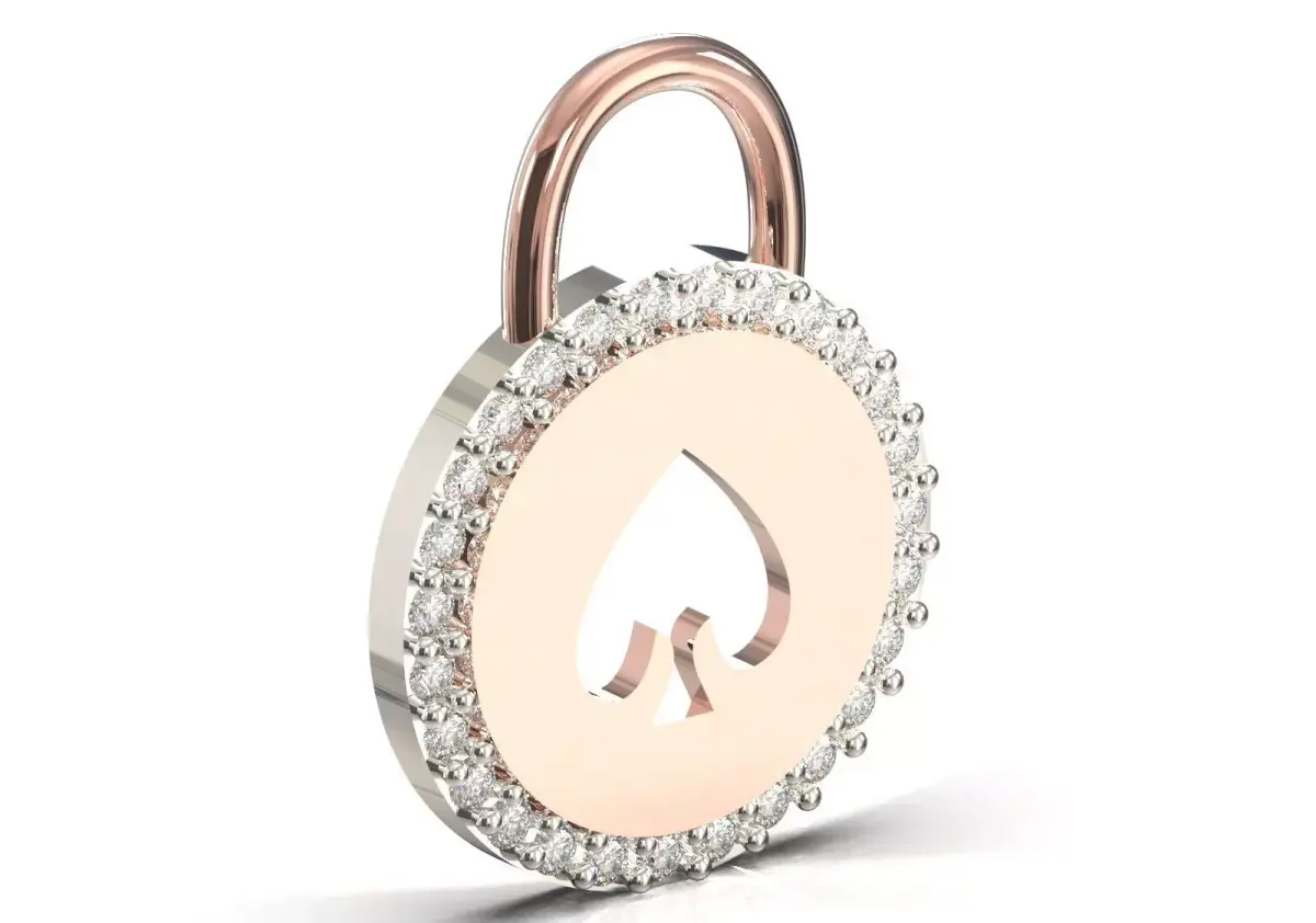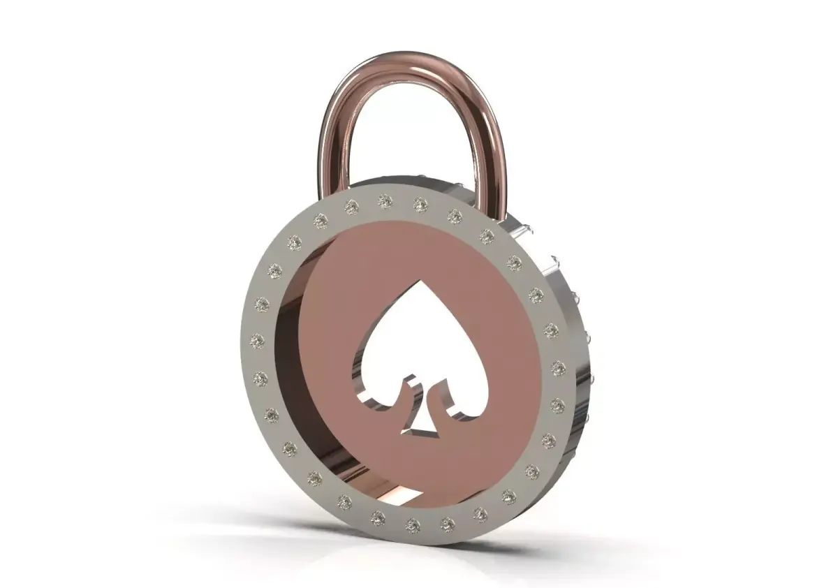 Lock Pendant JP0372: Round Padlock with Spade Symbol, Symbol of Luck, Casino Design and Dense Sparkle