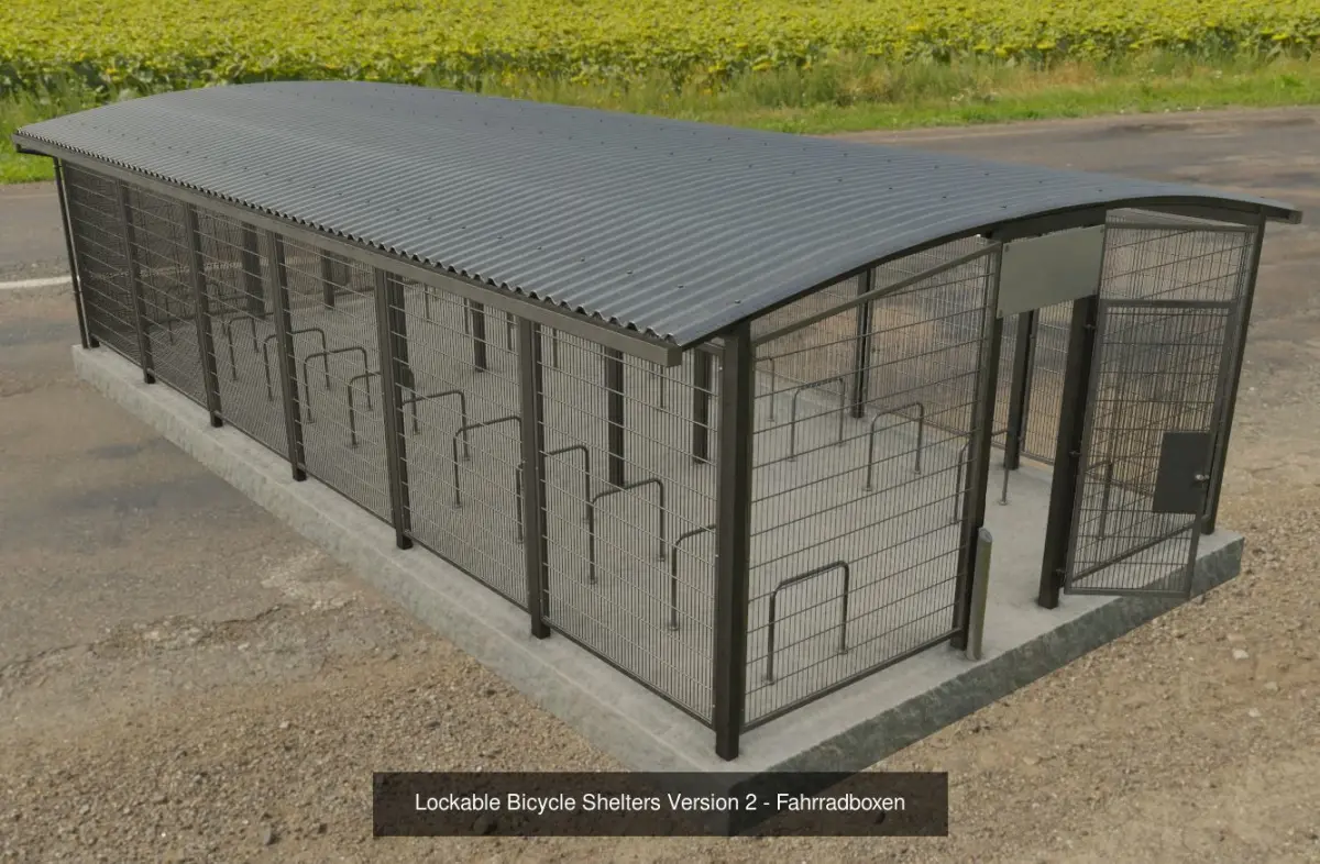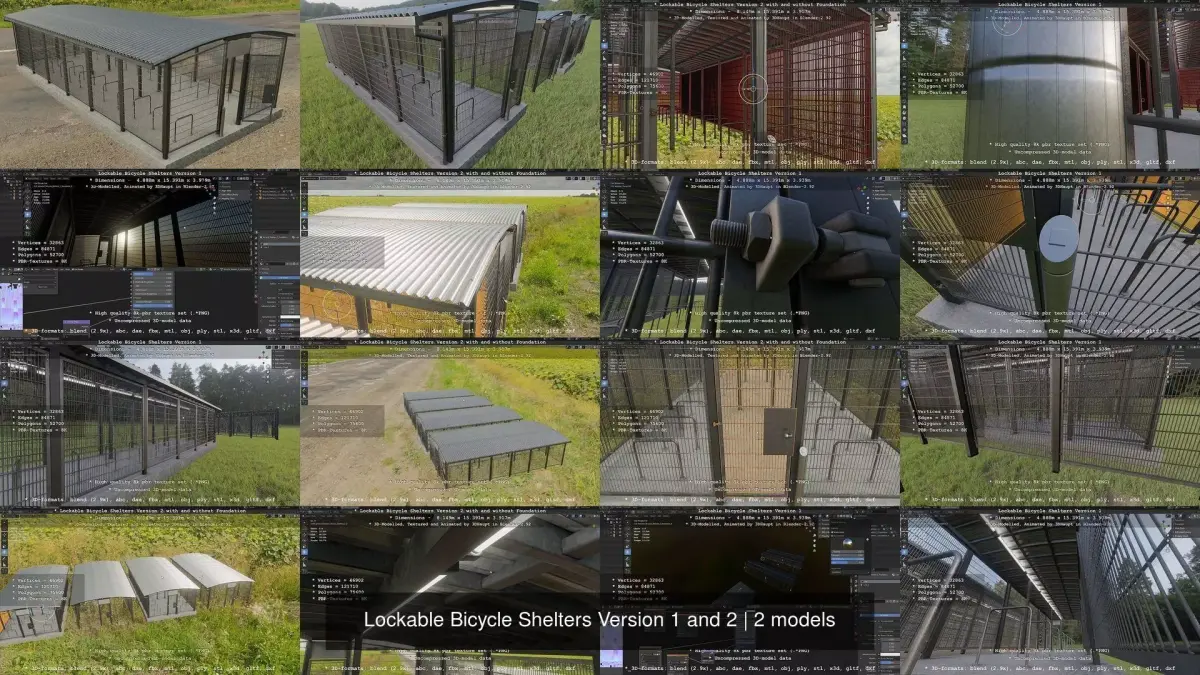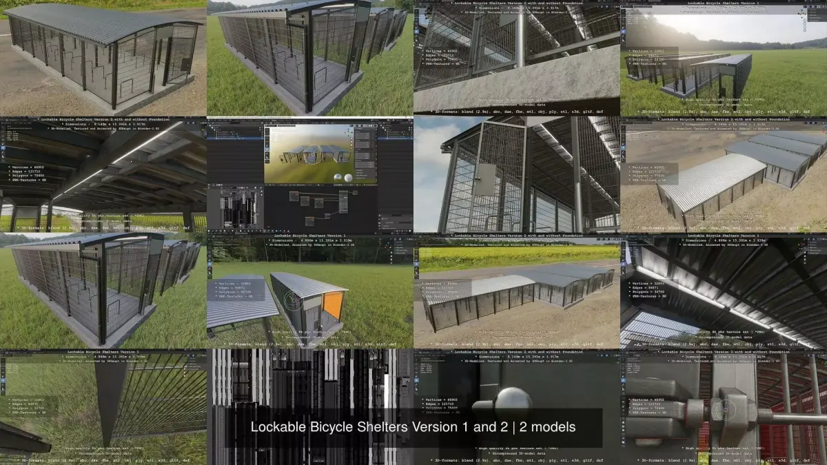 The pbr-textured version 1 and 2 of the lockable bicycle shelter with and without foundation.