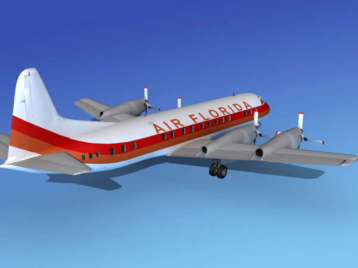 This model is built in November 2010 very near to scale and has high quality textures and materials. It comes with lots of exterior detail, animateable flaps, ailerons, rudder, elevators, and propellers. The landing gear can be retracted and landing gear doors closed. This model is a complete replacement for our earlier version of the L188 Electra. We have increased the smoothness of the faces and the poly-count, remodeled most of the aircraft from scratch, and reworked all the materials. It has interior detail including cockpit, cabin and galley. The cabin seating is a generic 66 seat arrangement. The cockpit includes the controls, instrument panels and seating as well as a flight engineers seat. Engineers panel is not detailed. Overhead panel is completed. The cabin includes the double walled fuselage, seats, with animateable drop down tables. Overhead racks are also included. Galley and lavatory bulkheads and doors are included. The interior of the model has blue seating and blue gray carpeted floor.