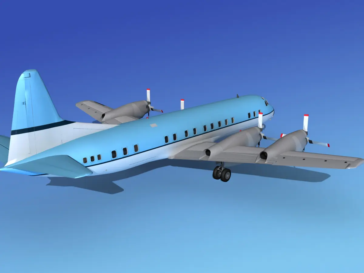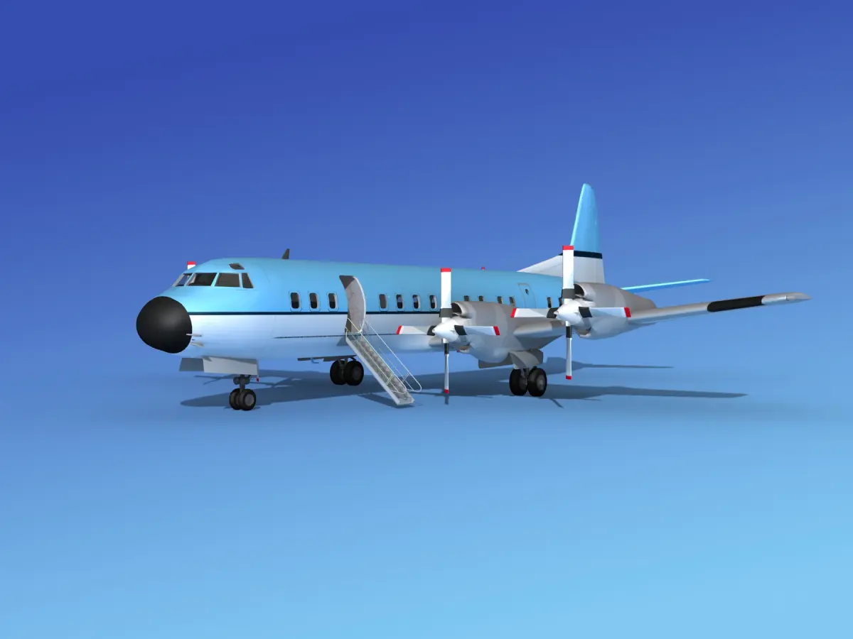 This model is built in November 2010 very near to scale and has high quality textures and materials. It comes with lots of exterior detail, animateable flaps, ailerons, rudder, elevators, and propellers. The landing gear can be retracted and landing gear doors closed. This model is a complete replacement for our earlier version of the L188 Electra. We have increased the smoothness of the faces and the poly-count, remodeled most of the aircraft from scratch, and reworked all the materials. It has interior detail including cockpit, cabin and galley. The cabin seating is a generic 66 seat arrangement. The cockpit includes the controls, instrument panels and seating as well as a flight engineers seat. Engineers panel is not detailed. Overhead panel is completed. The cabin includes the double walled fuselage, seats, with animateable drop down tables. Overhead racks are also included. Galley and lavatory bulkheads and doors are included. The interior of the model has blue seating and blue gray carpeted floor.