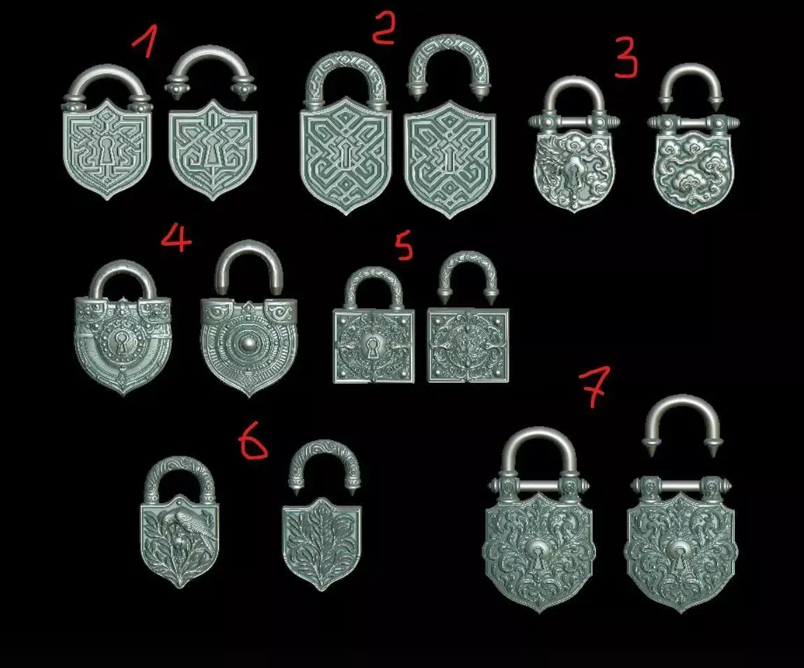 Fantasy Ornamental Padlocks & Keys Collection – 3D Printable ModelsThis exclusive collection features seven highly detailed ornamental padlocks and twelve matching antique-style keys, designed with precision for 3D printing, digital sculpting, and fantasy environment design.Each lock and key pair carries a unique artistic motif — from Celtic geometry and labyrinth patterns to mythical dragons, ravens, and floral engravings.7 Unique PadlocksLabyrinth Shield Lock – inspired by ancient maze patterns.Celtic Knot Lock – a complex interwoven design symbolizing eternity.Dragon & Clouds Lock – detailed oriental dragon relief with swirling clouds.Royal Emblem Lock – a circular ornamental lock with regal engravings.Twin Birds Lock – a square lock with mirrored bird and floral patterns.Raven & Leaves Lock – naturalistic design with a perched raven over foliage.Vine Scroll Lock – baroque-inspired foliage with symmetrical balance.12 Antique KeysEach key features distinct baroque, gothic, or romantic flourishes, complementing the locks’ style — perfect for fantasy worlds, jewelry design, prop creation, or decorative collectibles.This kit is designed for resin printing or casting. I plan to print it in metal for myself as a jewelry pendant.Behind the keyhole of each lock is a small cavity for perfume or essential oil. Each lock is provided either as a whole or in two parts. A painted version of each model (in *.ply format) is provided as a painting example. It does not include separate color textures. Ready to print, error-free, and easily scalable.