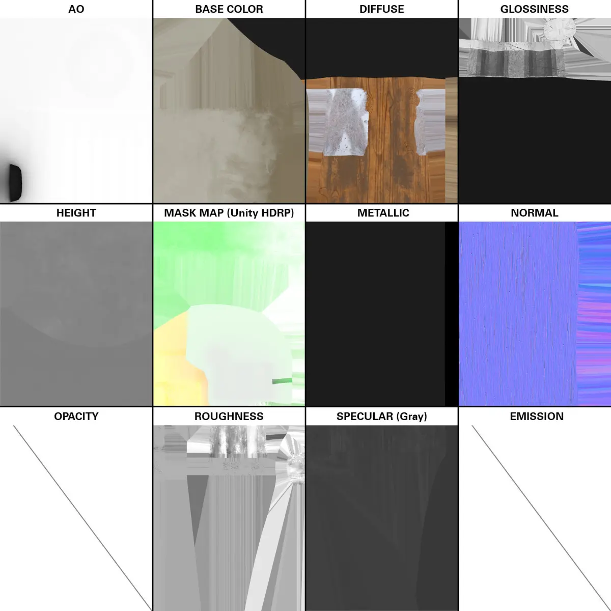 - texture maps for every render workflow (ambient occlusion, BaseMap, Diffuse, Emissive, Glossiness, Height, MaskMap (Unity HDRP), Metallic, Normal, Opacity, Roughness, Specular Gray/RGB)