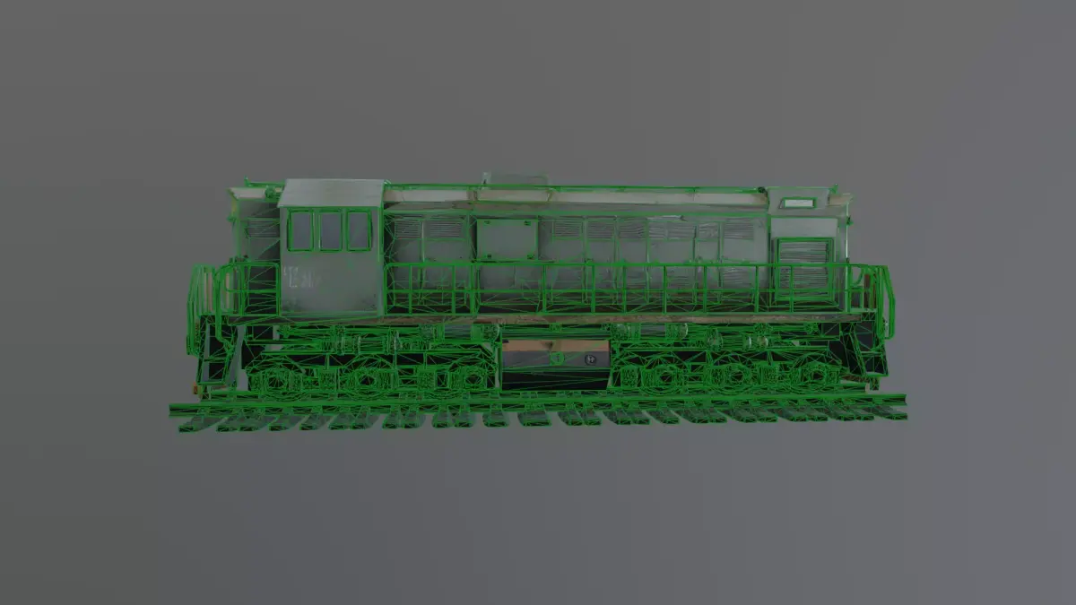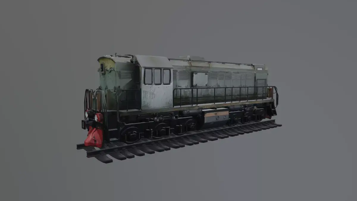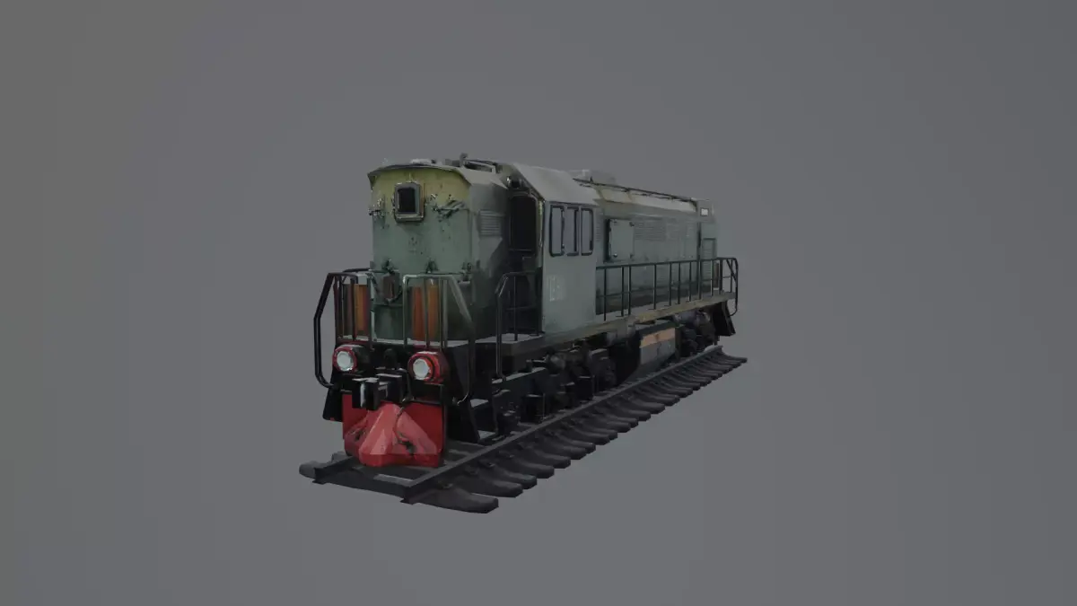A heavy industrial locomotive with a weathered exterior, featuring detailed mechanical components, railings, and undercarriage systems. The design emphasizes a worn, utilitarian look with visible panels, vents, and structural elements. Suitable for rail yards, industrial zones, or dystopian and post-industrial environments.