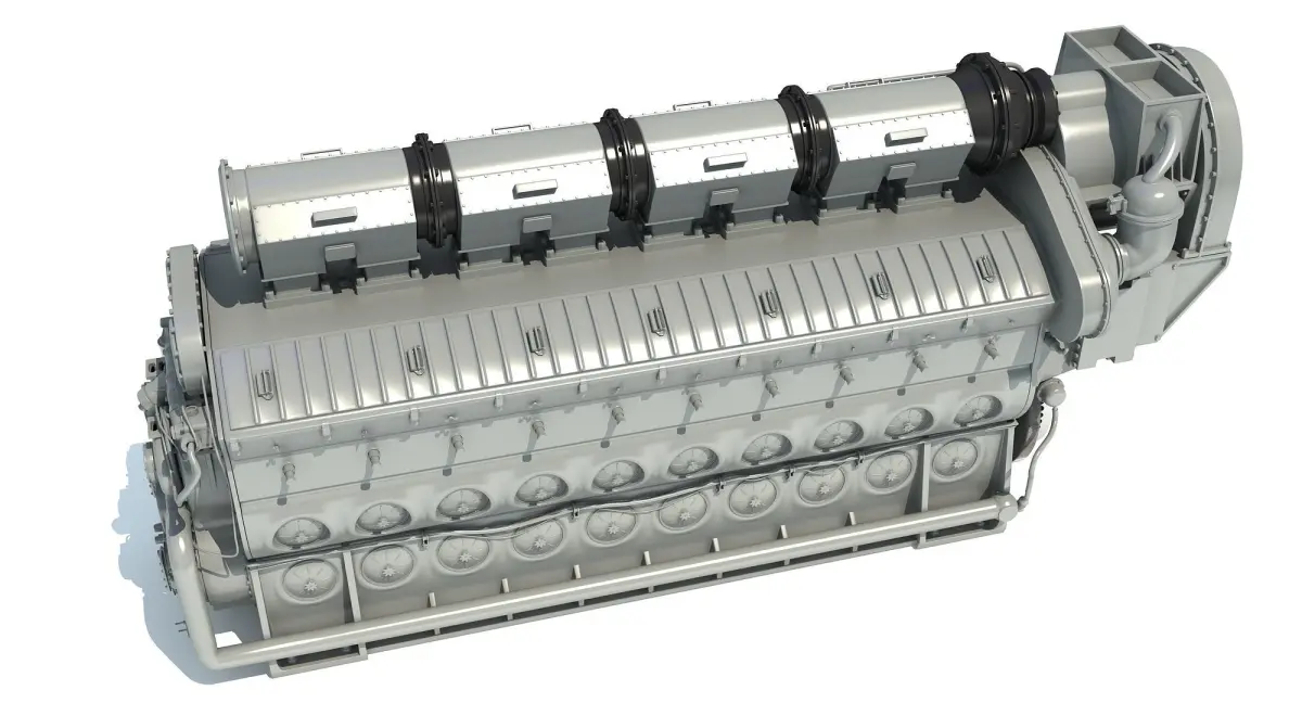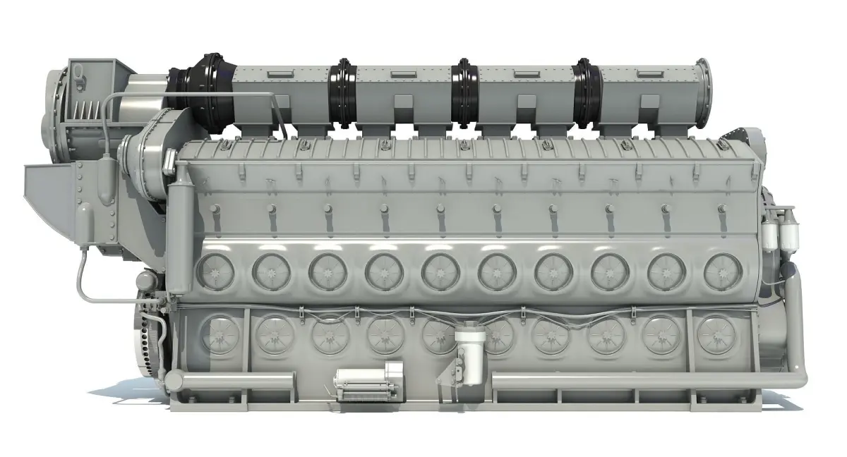Detailed and high-resolution 3D model of electro-motive EMD locomotive diesel engine.