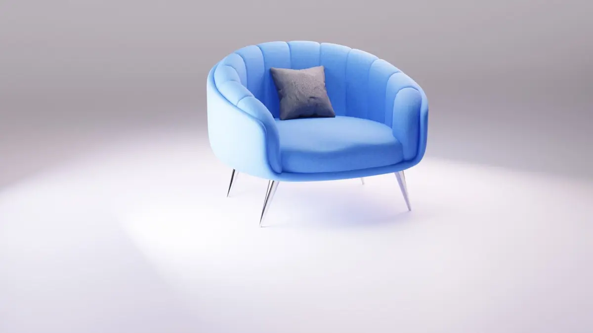 This 3D model features a stylish, contemporary armchair with a plush, light blue fabric upholstery. The chair has a rounded backrest with vertical stitching details, providing a comfortable and supportive seating experience. The sleek, tapered metal legs add a touch of elegance and modernity, making it an ideal addition to any living room or office space.