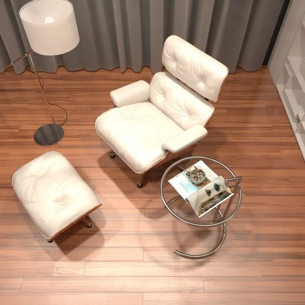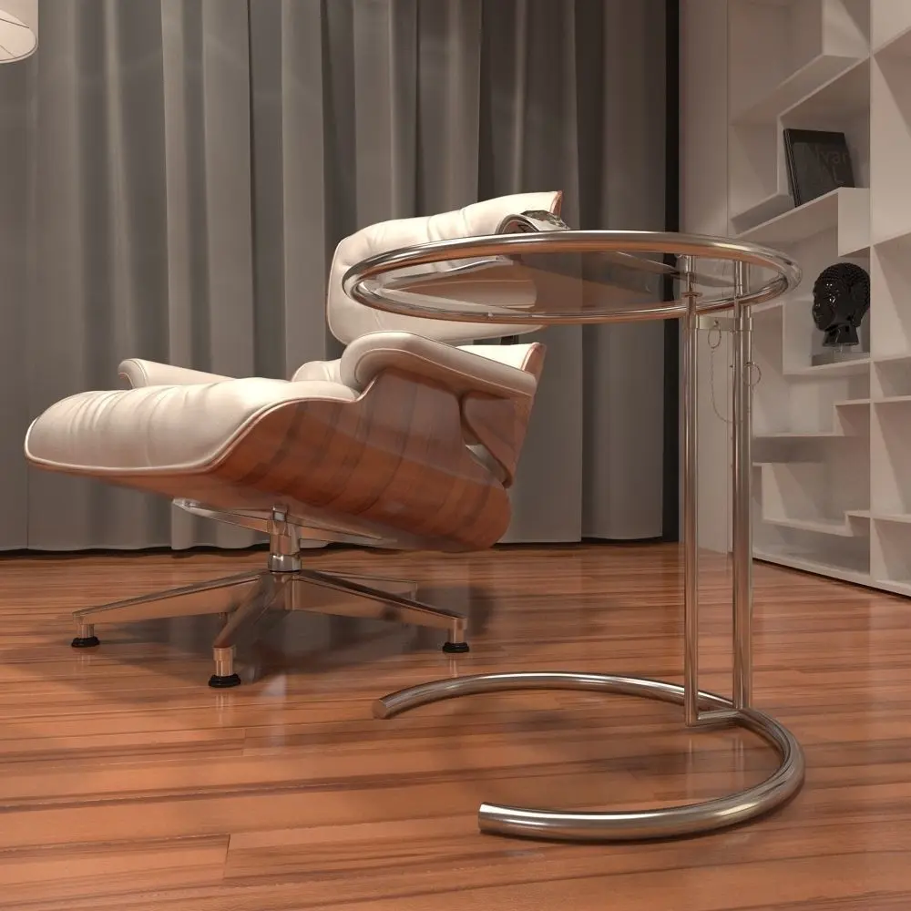 - eames chair with food rest, lamp, eileen grey table with decoration, shelf with decoration