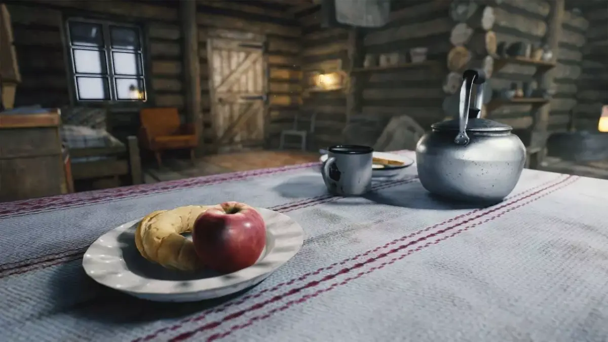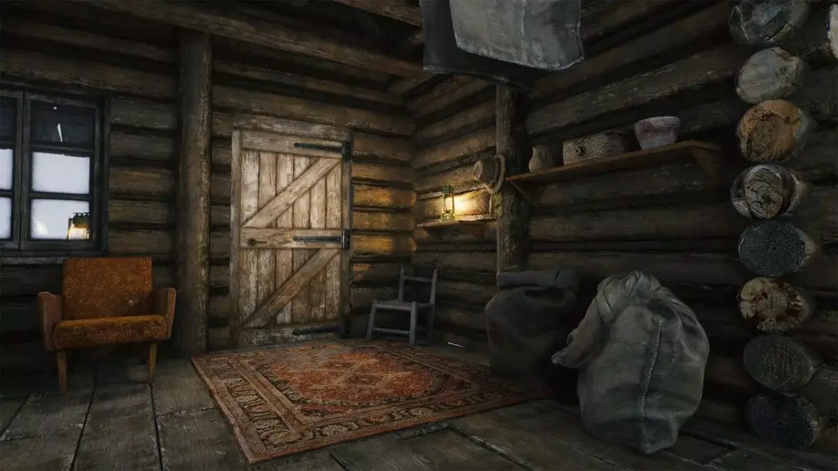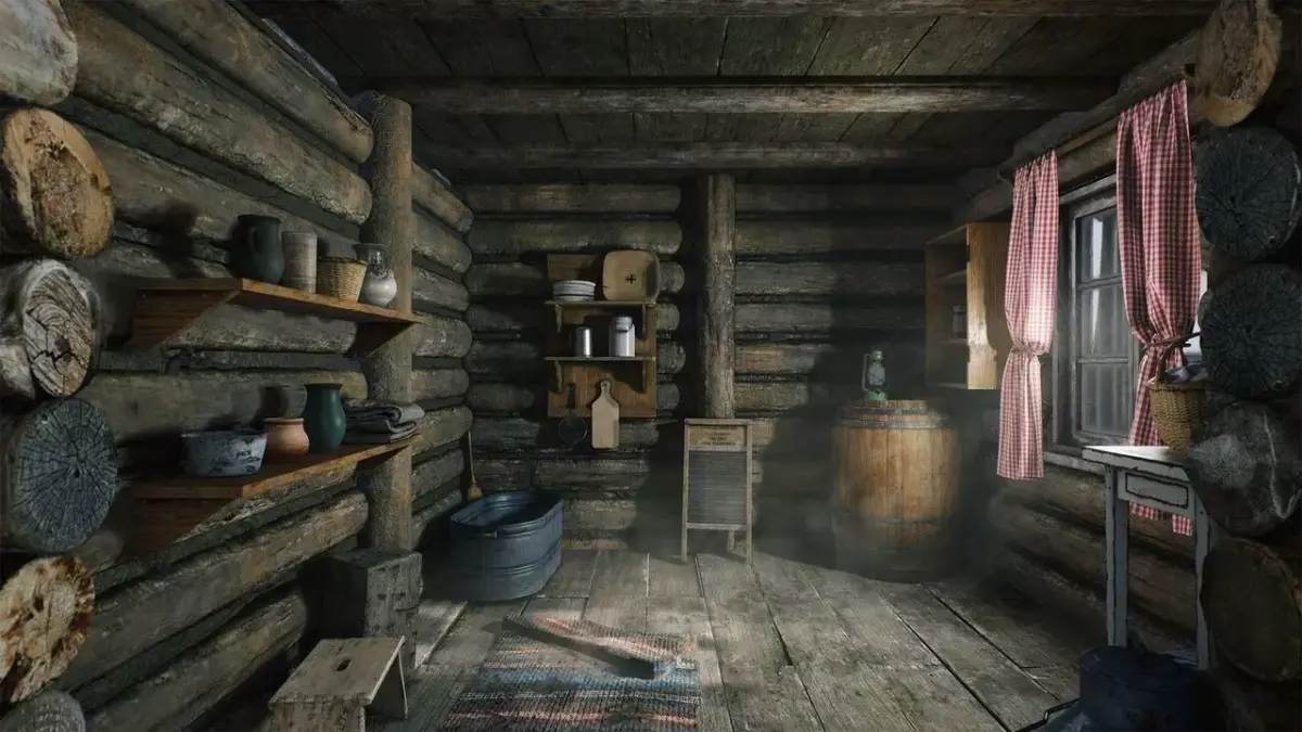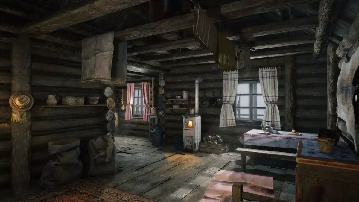 A popular, well-known, beautifully crafted, atmospheric forest environment piece, featuring a cozy log cabin with its interior, fully furnished, available in winter/snowy and summer/dry versions.