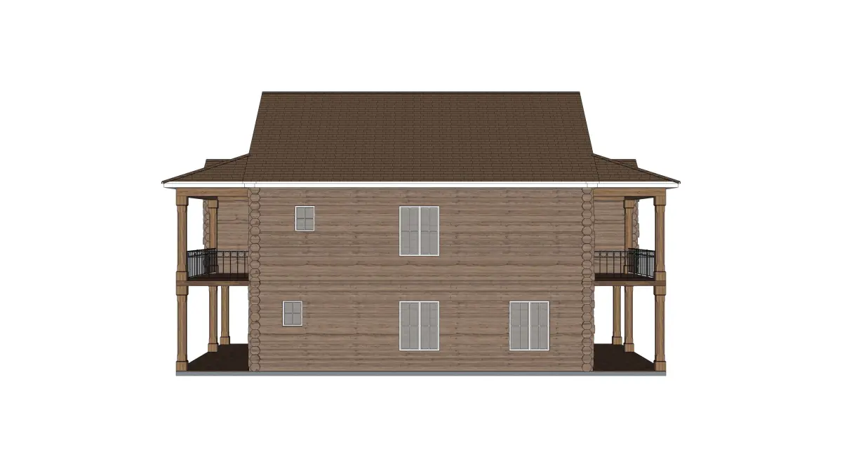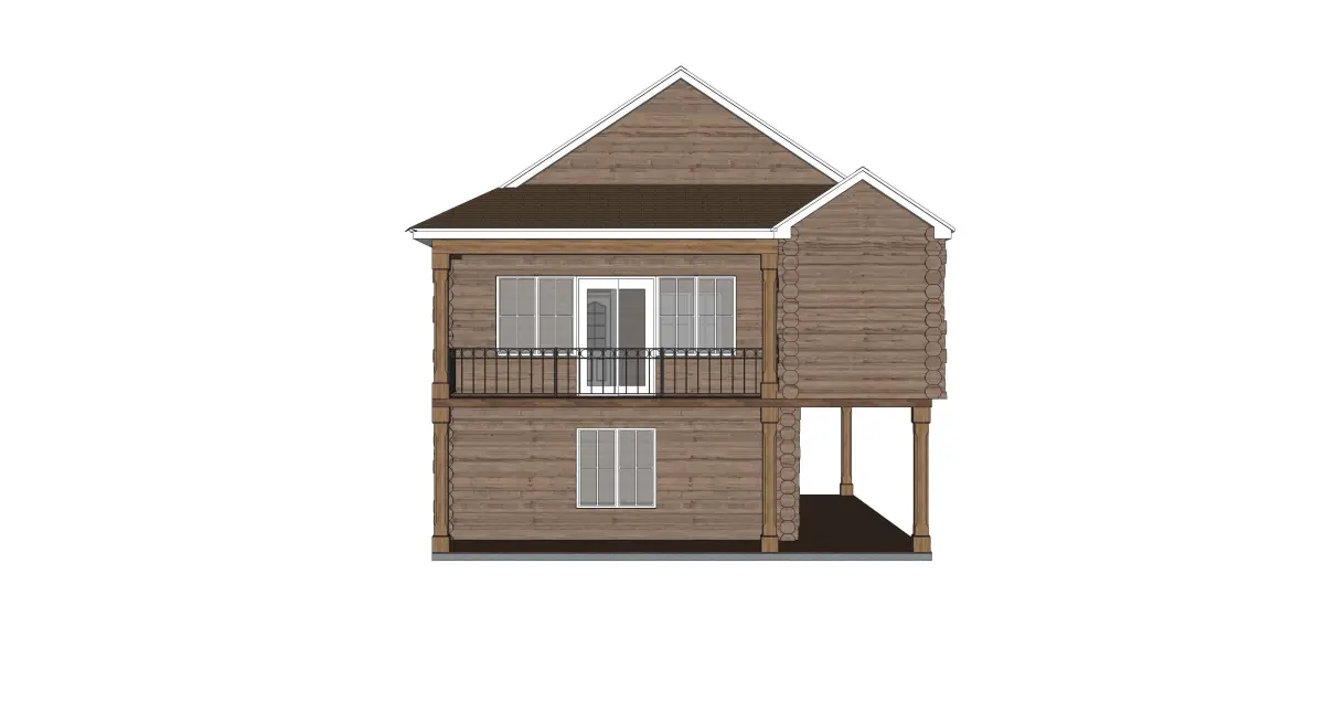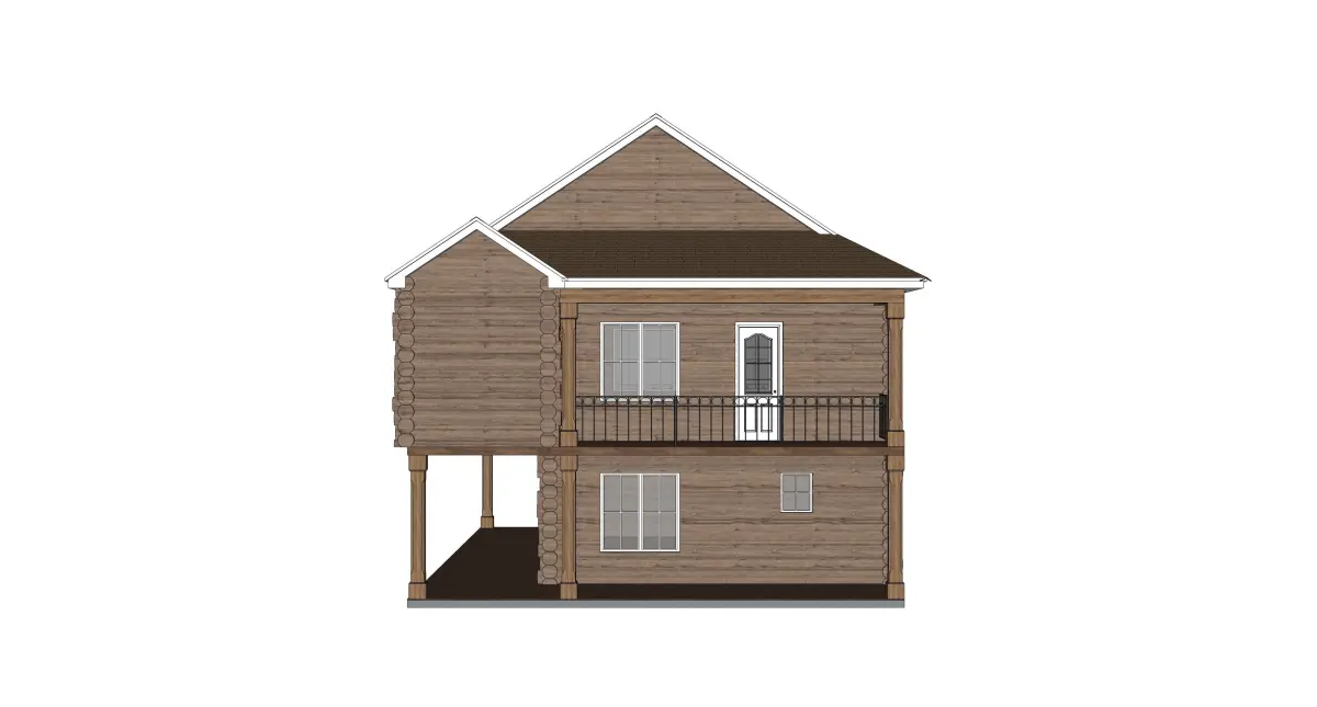 This log house is perfect for single-family living, designed to highlight weather changes and colors. It's a two-story home with excellent lighting and ventilation but no garage. The main floor features a large covered entry porch, lanai, great room, bedroom with bathroom, and an open kitchen with two dining bars and a walk-in pantry. Upstairs, there’s another bedroom with a bathroom and a master suite with a walk-in closet and master bath with double vanities, tub, and shower. The eco-friendly wood facade and strategically placed doors and windows enhance views and ventilation. This three-bedroom log cabin promotes health and happiness.