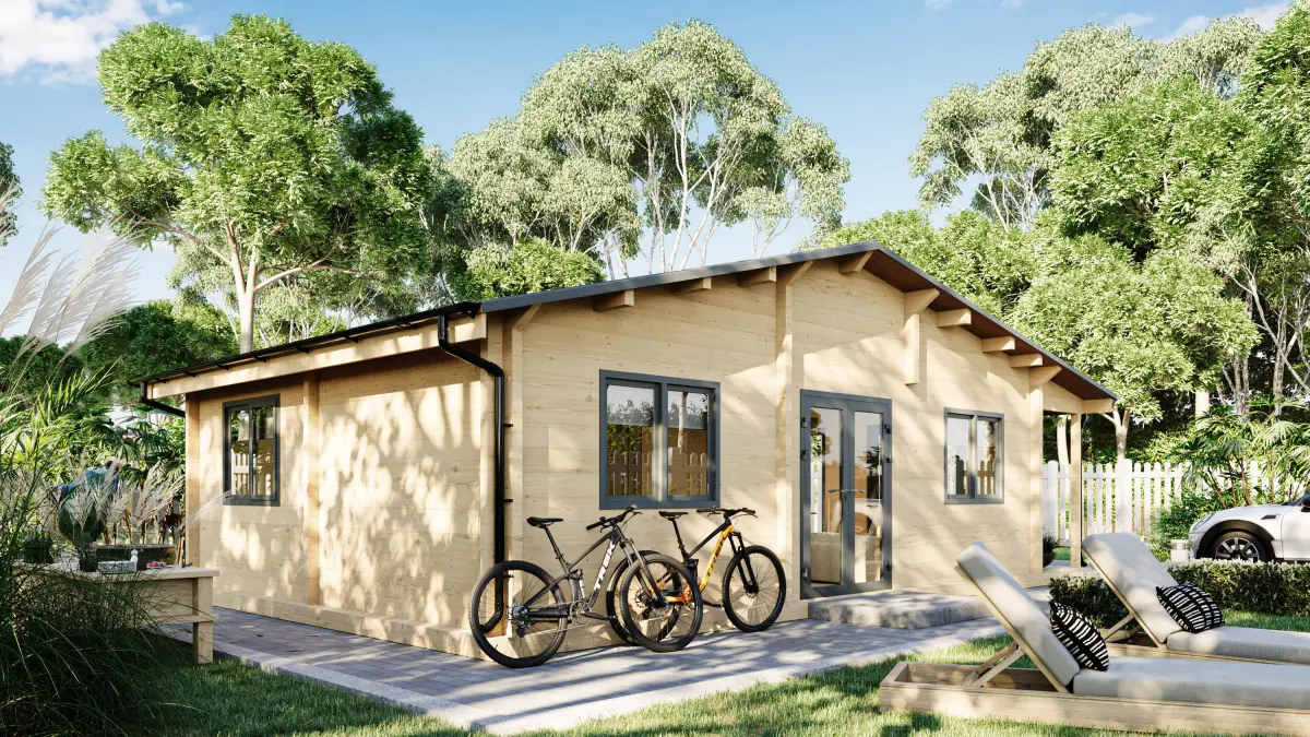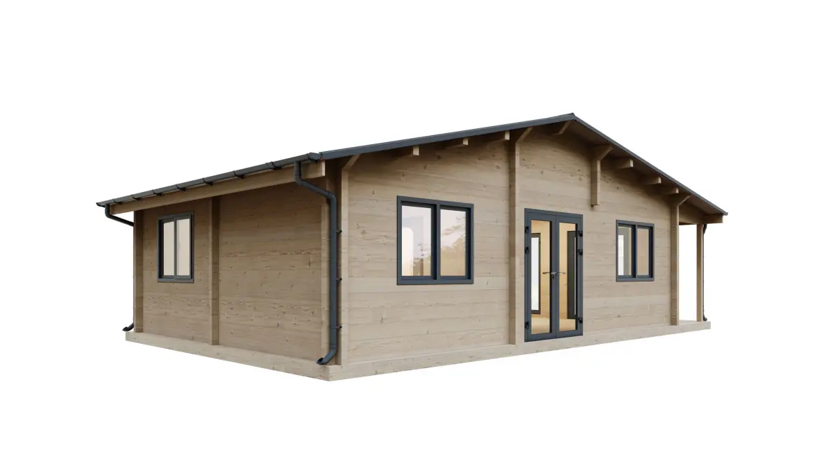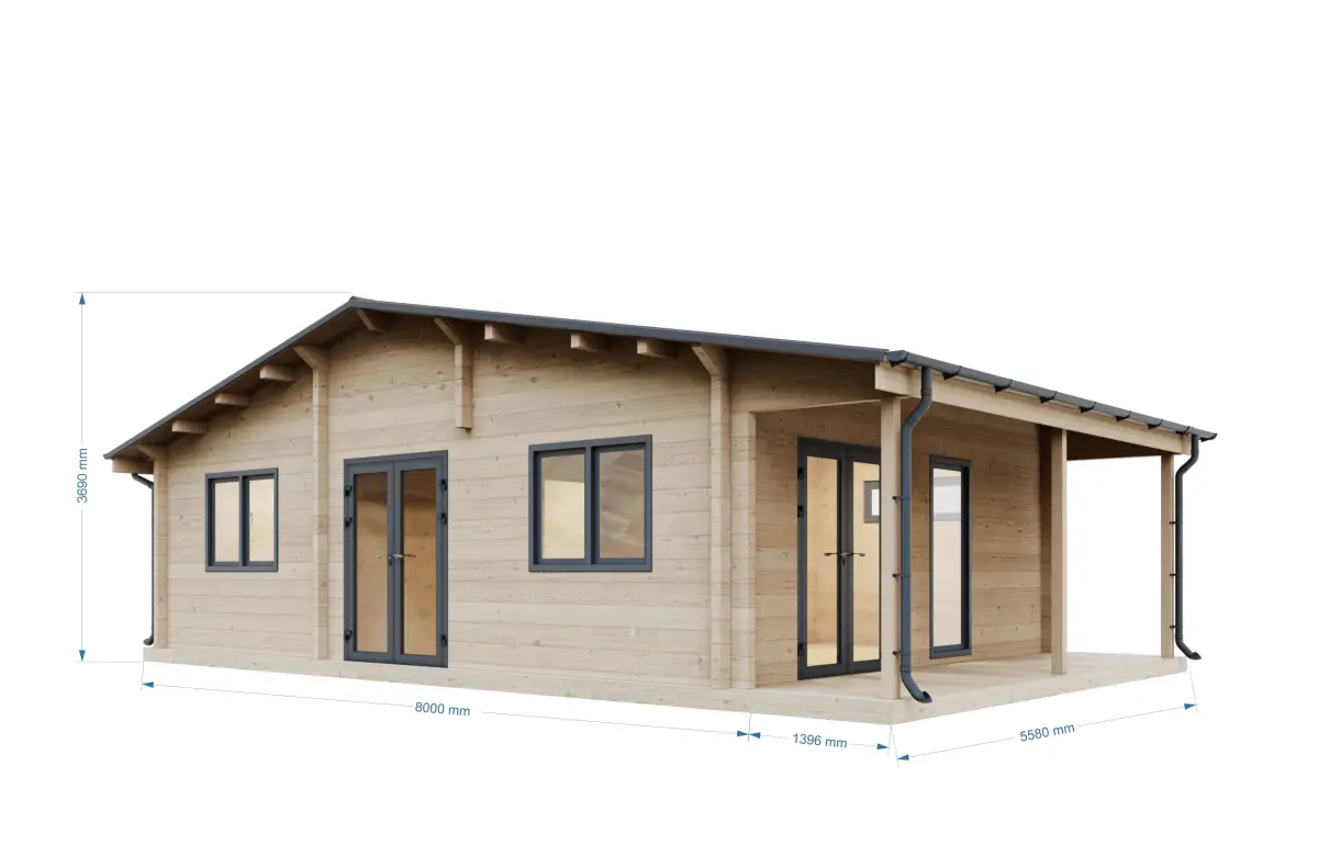This is a 3D model of a wooden log cabin house 8x5,5x3,7 meters in dimensions. The roof and gutters have been modeled using RailClone and converted to editable poly.