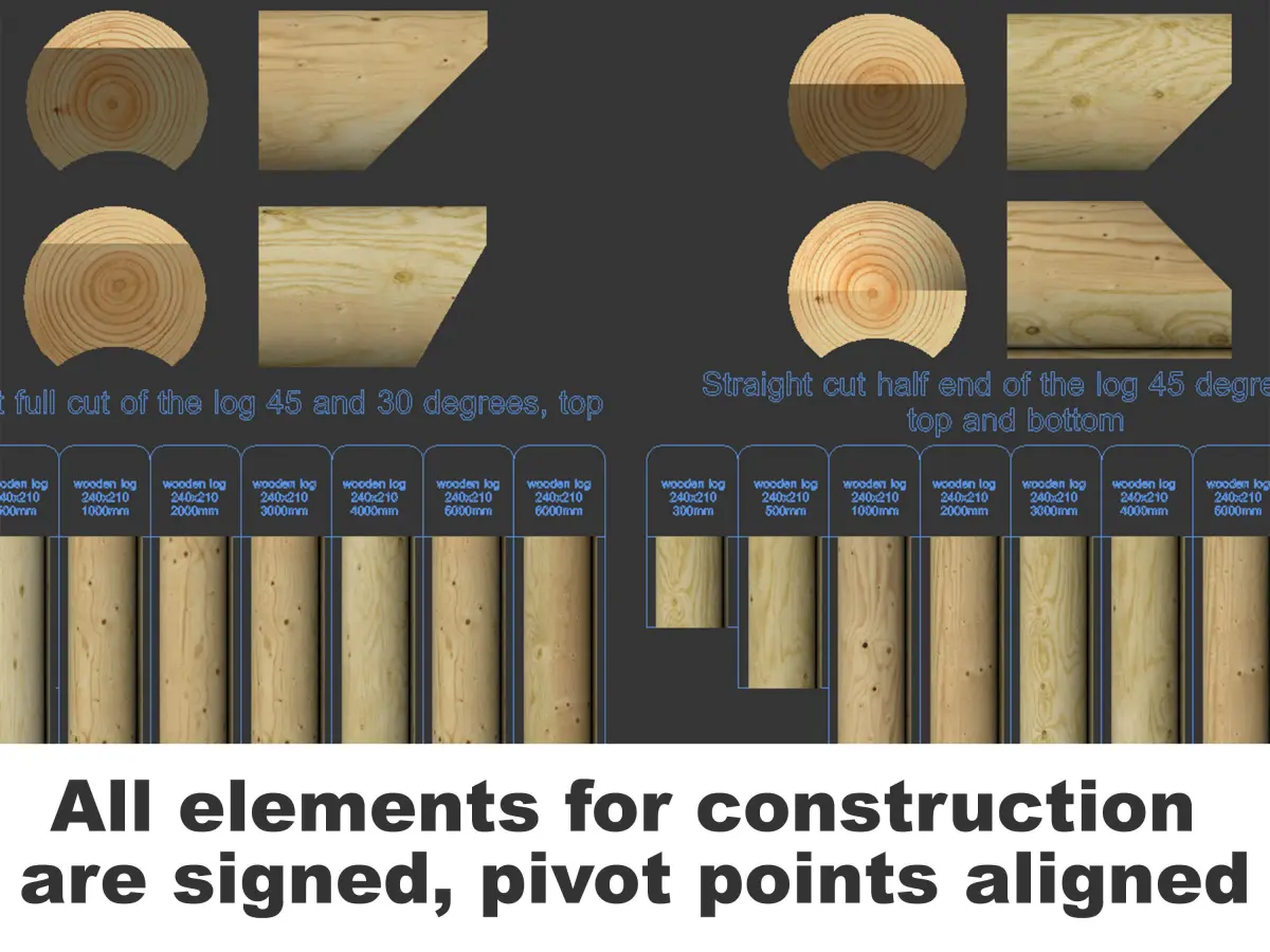 It seems that I often come across the construction of this type of architecture, I was forced to create for myself and you - a 3D log construction set. In the constructor, I collected all the possible ends of the logs that can be used when building this type of architecture. All logs have their own names, and are placed in sizes from 300mm to 6000mm (300mm, 500mm, 1000mm, 2000mm, 3000m, 4000mm, 5000mm, 6000mm). Smoothing groups are assigned to all logs and the ends have their IDs 1-2, you can easily control selection of one or another group of polygons for texturing. The textures are all mapped in the same size, and the tiling does not change when the log is increased or decreased. In this constructor, a 240mm average log is presented among its options, there is also a template with which you can select all the logs and adjust to the size you need (about 8 types, you will see inside). I also textured and laid out almost all sizes, just drag and build, easily change textures and ends (no scripts). I also saved a separate file (it is signed) where I translated everything into poly The house is included I hope you will save your time, good luck to everyone and beautiful architecture in your portfolio!