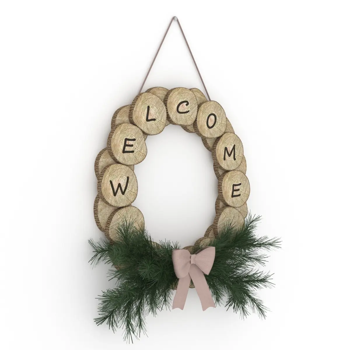Wreath made out of some log, branches and a bow tie.