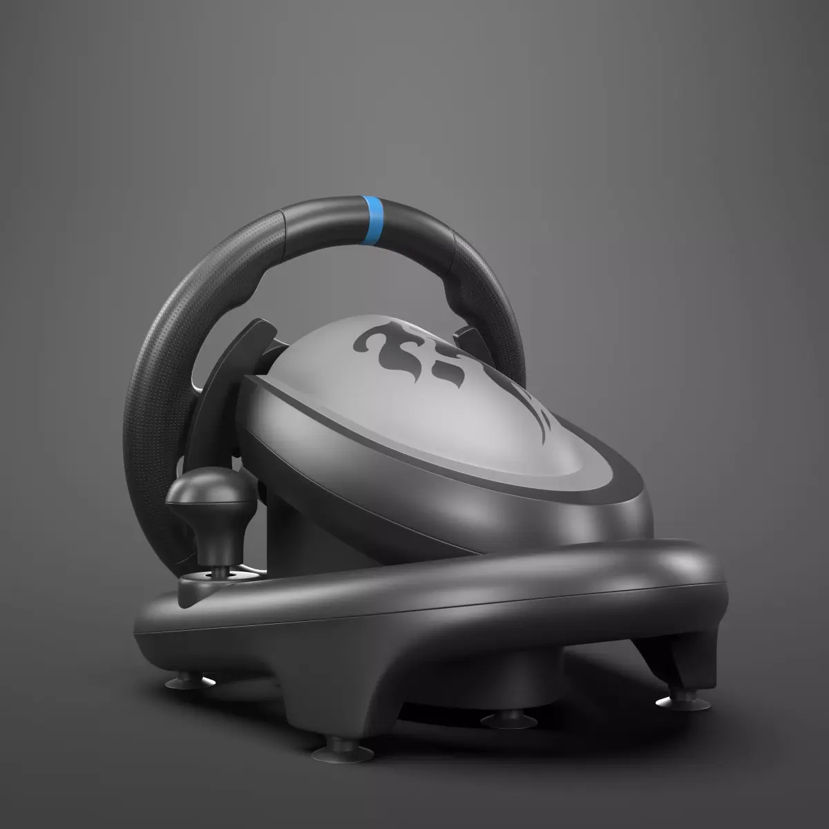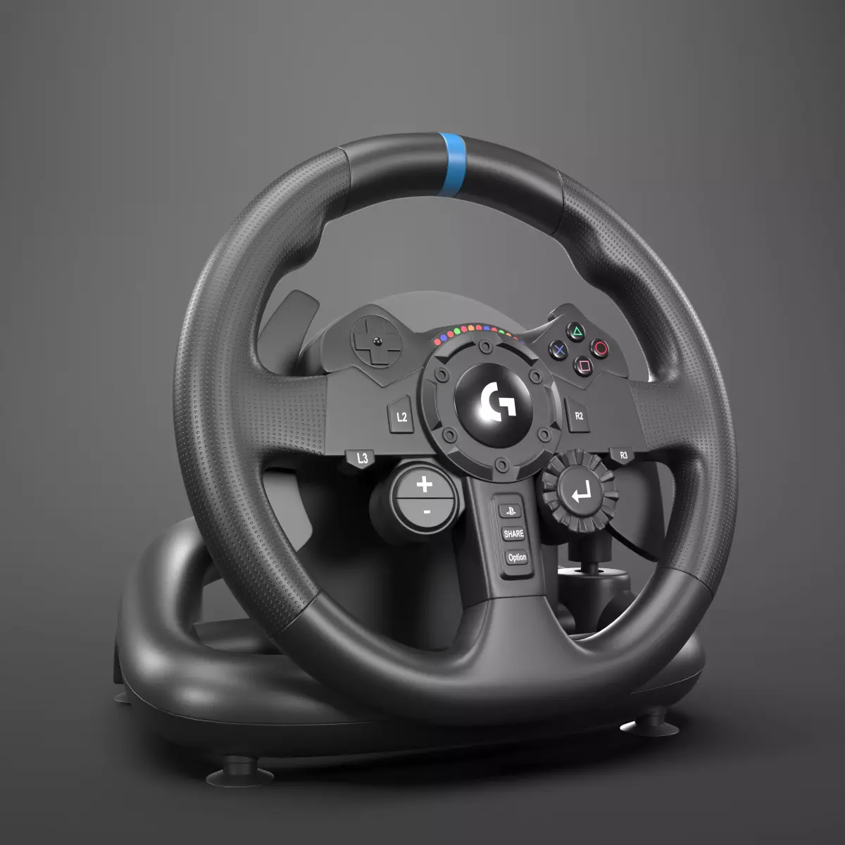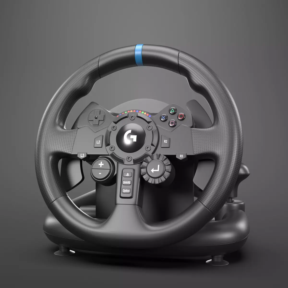 High-quality Logitech G920 Driving Force Racing Wheel 3D Model, designed for realistic racing simulator scenes, product visualization, and game environments.