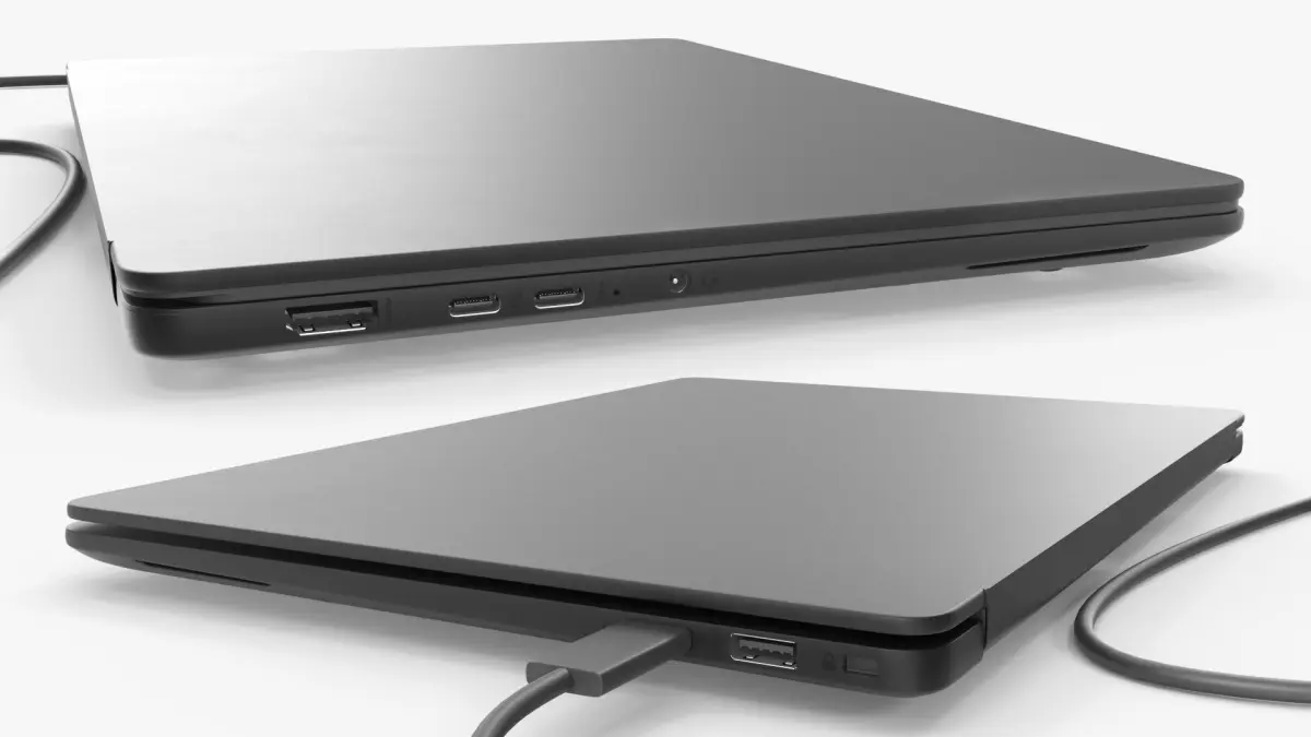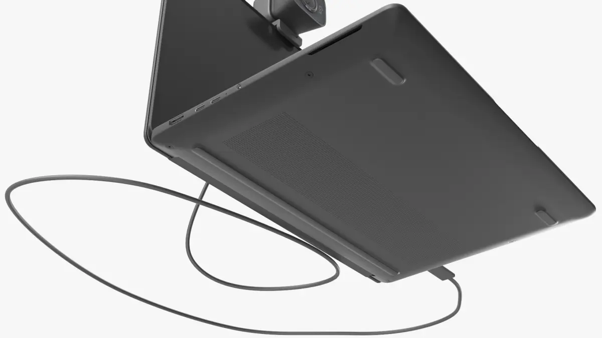 The model showcases a sleek, modern laptop with a high-resolution screen. The external webcam is mounted atop the laptop, connected via a USB cable, and designed for enhanced video quality and versatility. The combination provides an efficient solution for various digital communication needs, offering flexibility in positioning and usage.