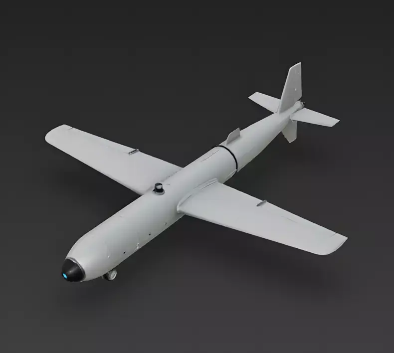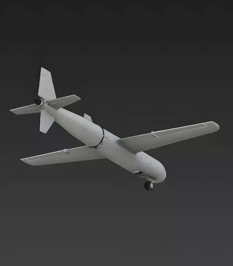 The Overall Concept This model depicts a suicide drone or loitering munition, designed as a precision strike asset. Its design emphasizes simplicity and aerodynamic efficiency, featuring a slender, tube-shaped fuselage paired with high-aspect-ratio wings for extended flight endurance.