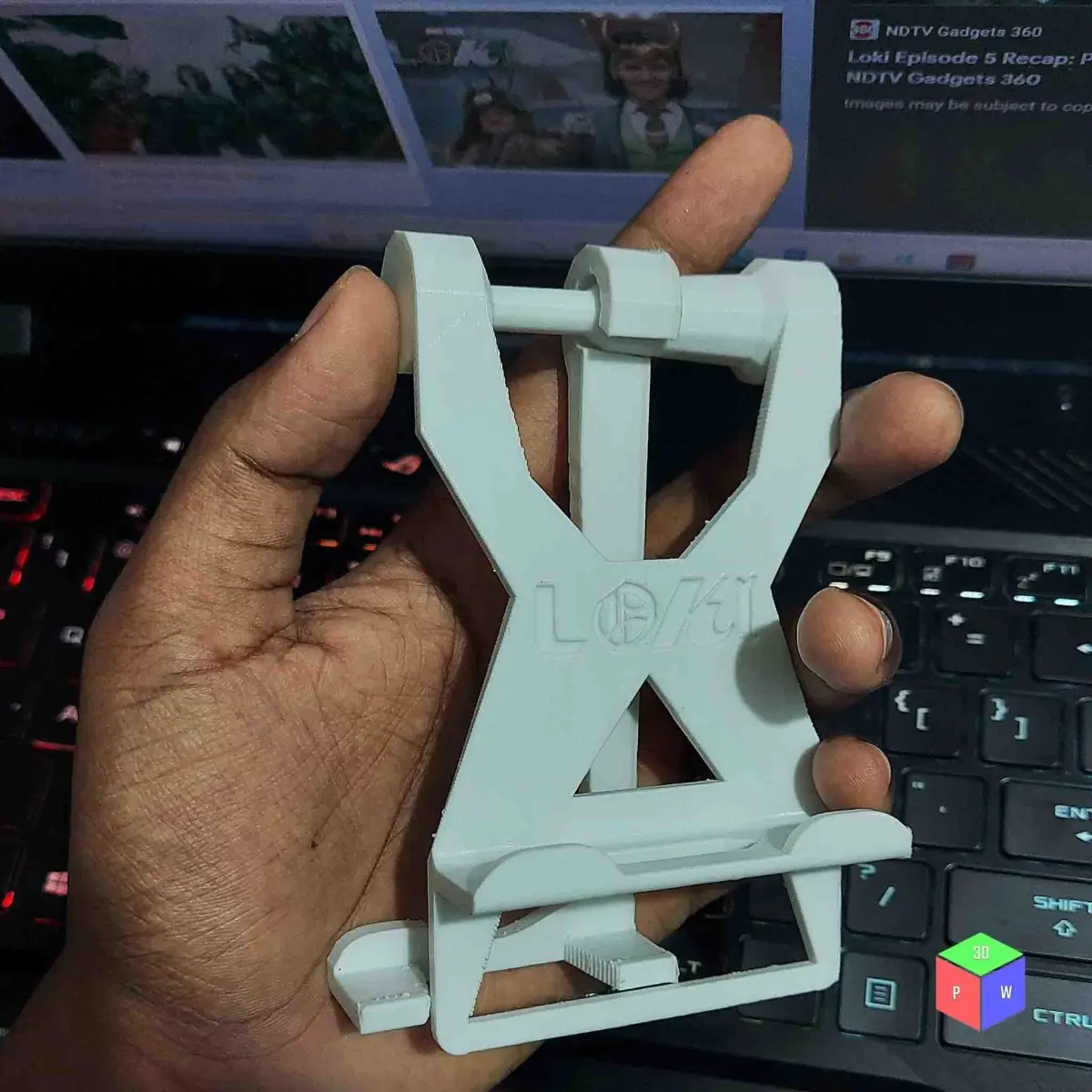 . Easy To Print.. Loki Text Engraved.. Given Enough space for charging plug.. Light Weight - Approx.~26 gram only.. Consists of Two Parts - Hard Edged Cool Body and Stand Stick.. Articulated body (no need of glue to combine). Dimensions - Approximately 120 mm long and 70 mm wide.. 180-degree rotation.. Slide function to tighten or loosen the frame.