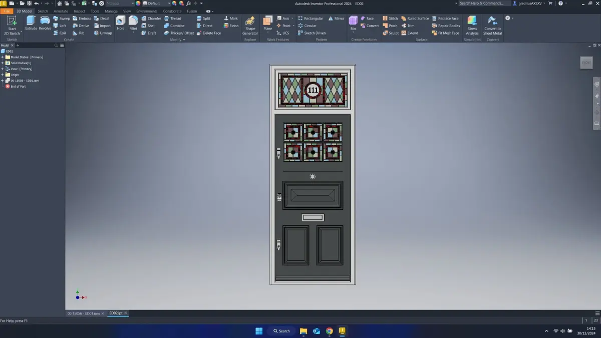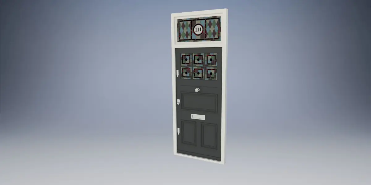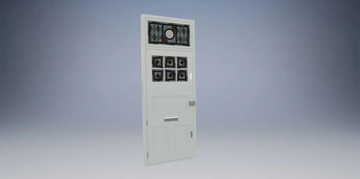 Created in Autodesk Inventor. This 3D model showcases a striking entrance door adorned with vibrant stained glass. The geometric patterns and jewel-toned colors create a captivating visual display. The door features a rectangular stained glass panel above, complemented by smaller stained glass inserts on the lower half. The overall design exudes a sense of elegance and artistic flair, adding a touch of grandeur to any entryway.