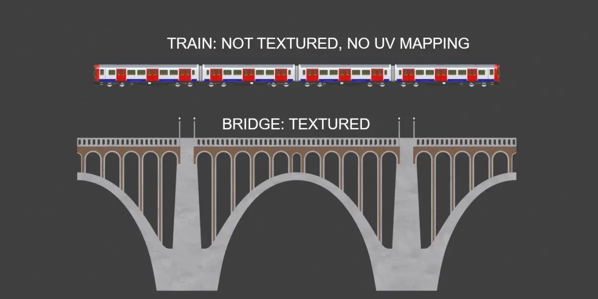 - Train model is NOT TEXTURED (NOT UV MAPPED).