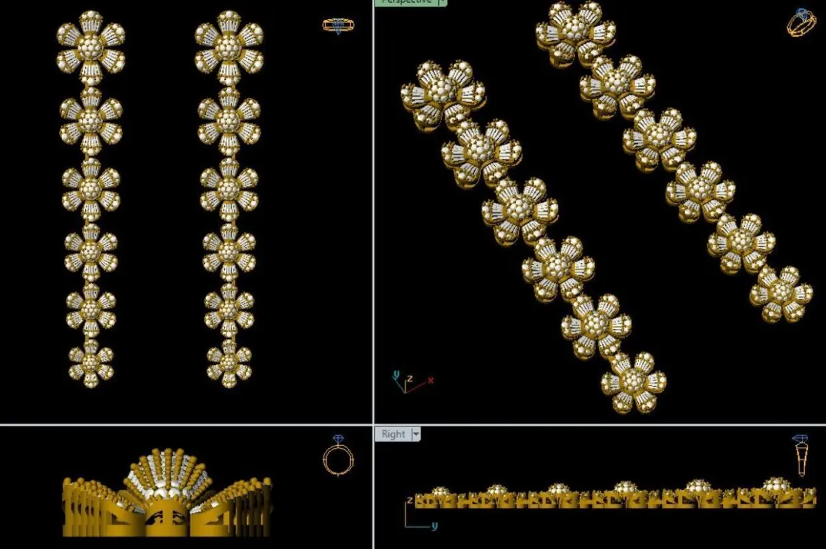 "Floral elegance meets timeless sparkle, These exquisite long earrings, adorned with delicate flowers and shimmering baguette diamonds (WAX SETTING), are the perfect statement of grace and beauty.