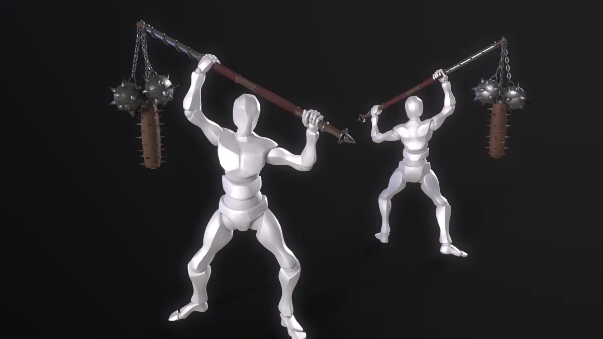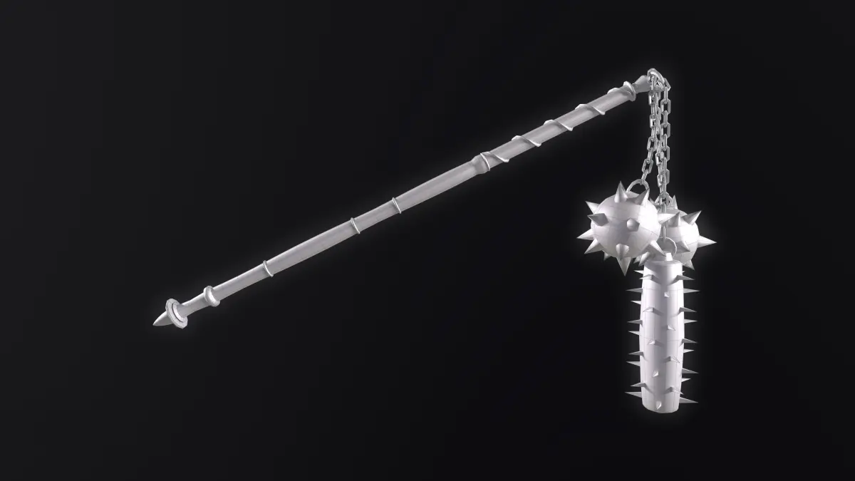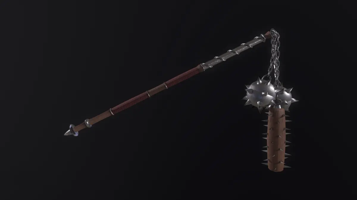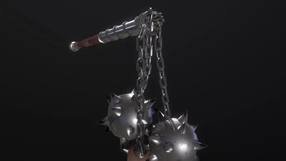The flail as a weapon has existed since the late medieval period. Appearing almost exclusively in art, and fantastical art at that, many historians doubt that it was ever actually used in real combat, but that's hardly any reason not to let imagination run far with them in fantasy. Many were depicted with shorter handles, but some had a much more long shaft such as this rendition. If it ever did get used, the longer shaft would have been most effective as it could be used as anti-cavalry, but some may argue it's not so much the length of the shaft that matters as much as the way it's wielded. Depictions sometimes included blunted rivets for extra impact; or, in the case of this rendition, metal spikes for deeper penetrating power. Often they featured either a single cylindrical club shape on a chain or a single metal ball on one, but rarely they used multiple chains with multiple striking objects. This model combines both common shapes with a single hard wooden rod accompanied by two balls of steel.