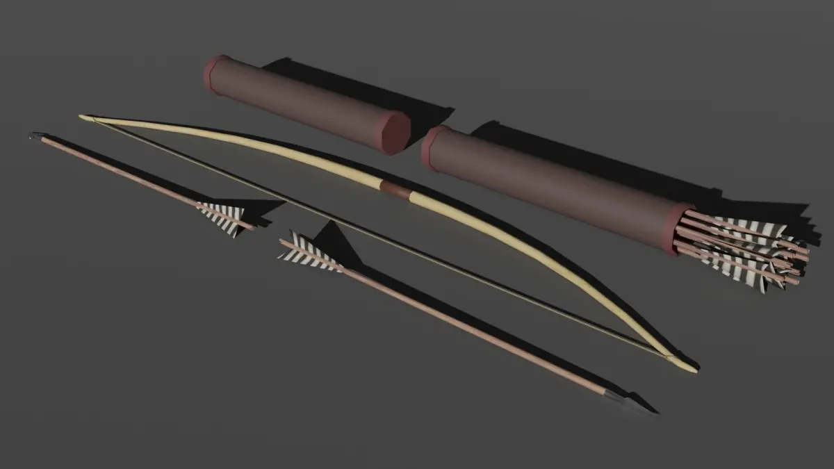 A low poly medieval longbow, arrow, and quiver models. The bow is fully rigged and has 2 animations: draw and release. Each model comes with PBR textures in 2K resolution for the bow and quivers and 1K resolution for the arrows. The arrow textures have clean and rusted head variants and the Blender file has materials set up with mix RGB nodes to switch between them. Textures in the blend file are referenced via relative paths, so extract the textures from the Textures.zip folder and place them in the same folder as the blend file to automatically link them.