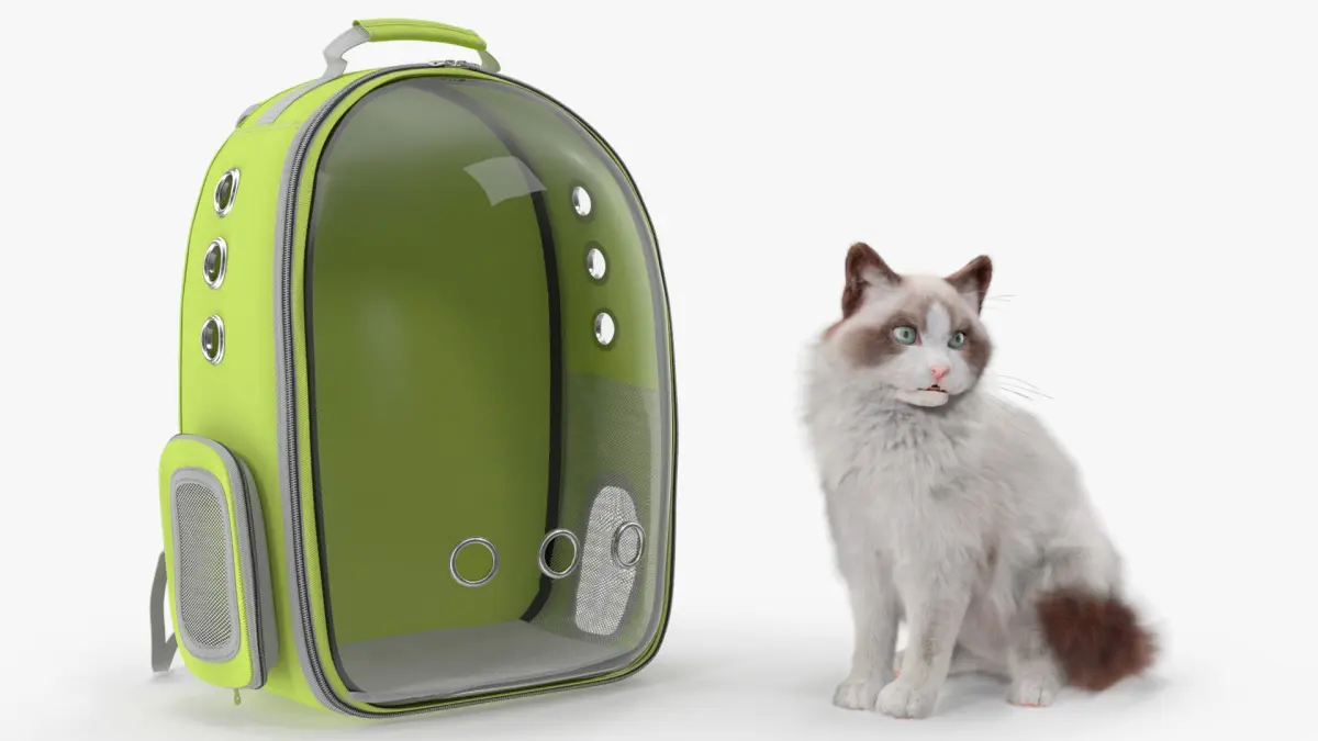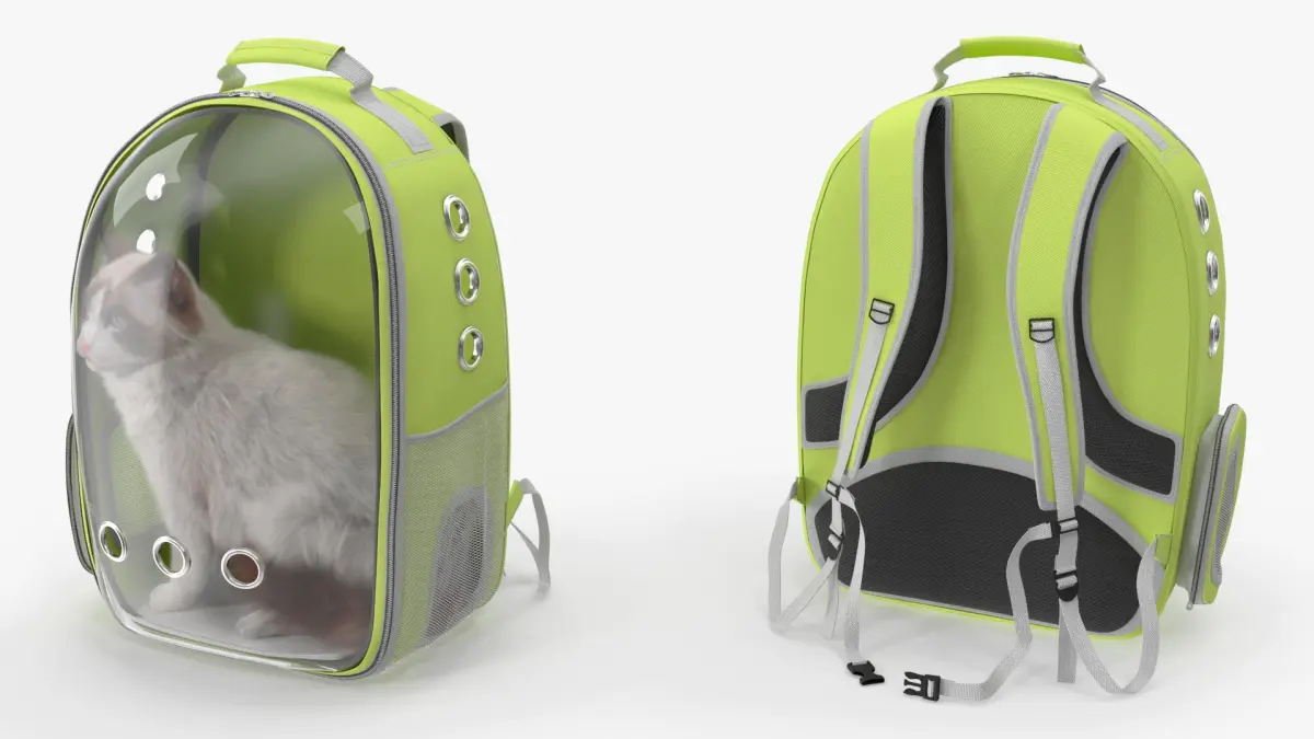 For pet accessory visualizations, e-commerce product showcases, veterinary clinic displays, animal transportation safety demonstrations, pet travel product marketing, virtual reality pet care simulations, and creative advertising campaigns featuring animals in modern travel gear.
