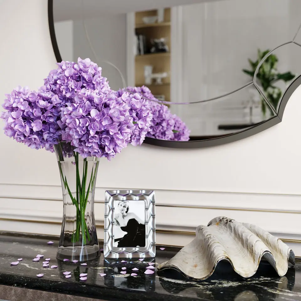 - A shell of a giant tridakna, flowers in a vase, a photo frame and another decor.