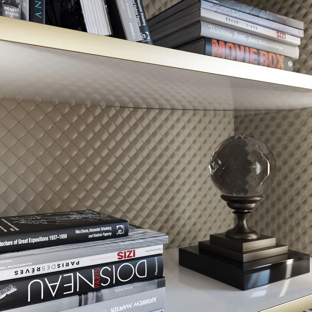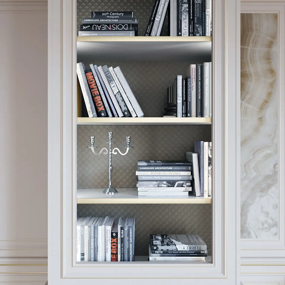 - Modular Longhi Heritage boiserie system in neoclassical style, consisting of illuminated shelves, wall modules, molding, cornice, and plinth.
