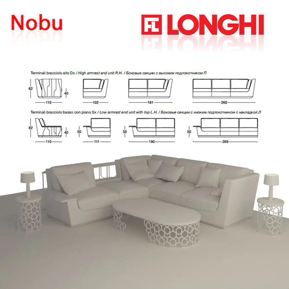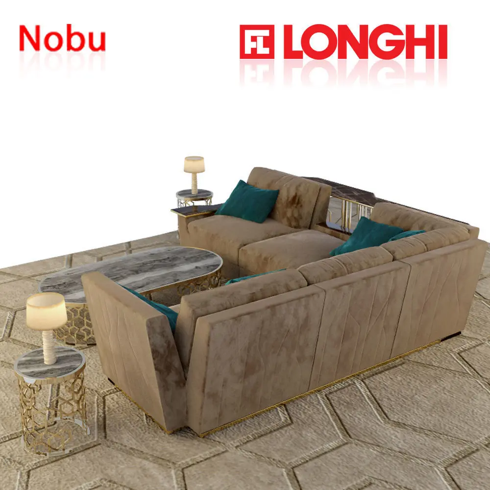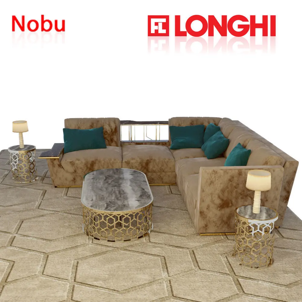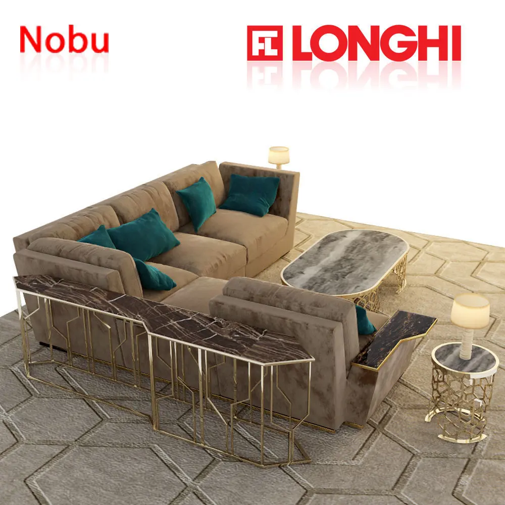 High quality longhi nobu sofa with center table, side table, console table and rug Wooden structure with elastic straps, covered in polyurethane foam with high density of different densities. Seat cushions in sterilized goose down with insert in polyurethane foam of different densities with reinforcement Visco Soft. Back cushions in sterilized goose down with insert in soft polyurethane foam share. The outer covering of the structure is quilted. Wood base coated in the same coating material. Finishing ring of metal base available in glossy light gold, polished chrome, polished chrome black or matt satin bronze. Down armrest Floor: Frappuccino marble, marble Calacatta Gold, pink mirror, blue, bronze and smoky. the complete longhi furniture set models with textures and fbx is attachedhope you will like itthanx.