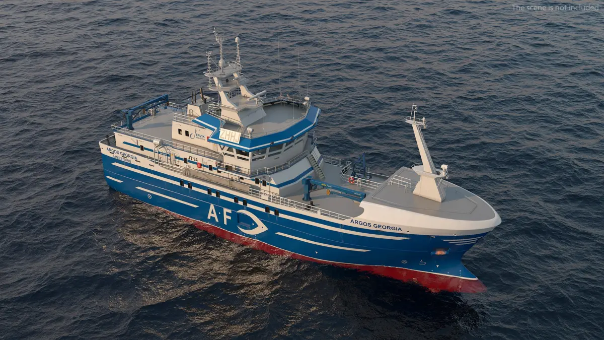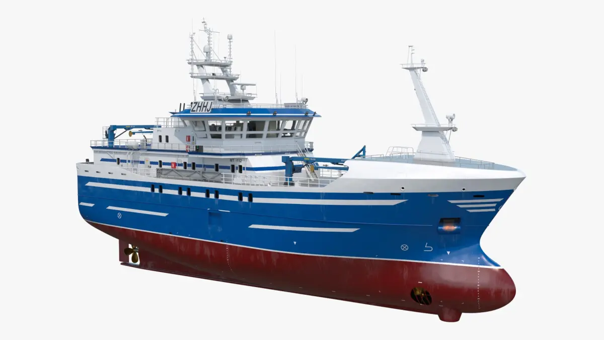 Longline Fishing Vessel Blue is a 3d model of a modern fishing vessel, showcasing its detailed structure and design.