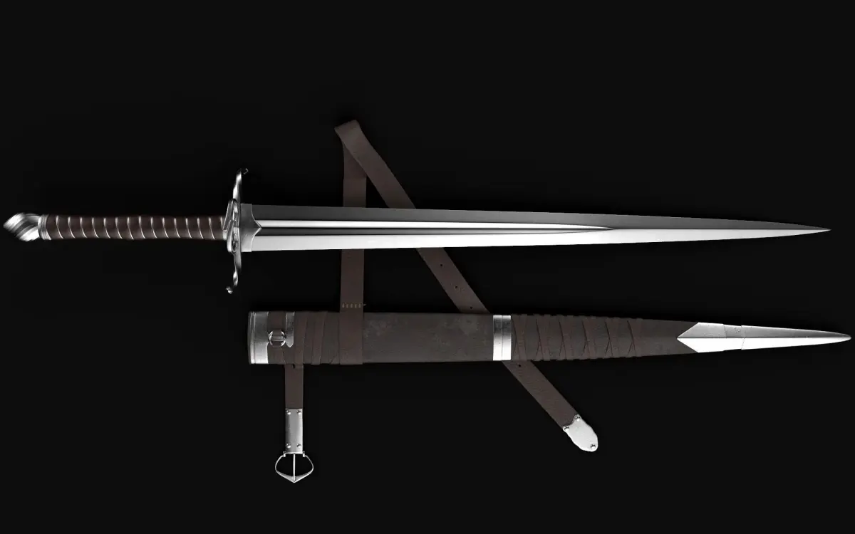 Scene contains three objects: a sword, a sheath and a belt.