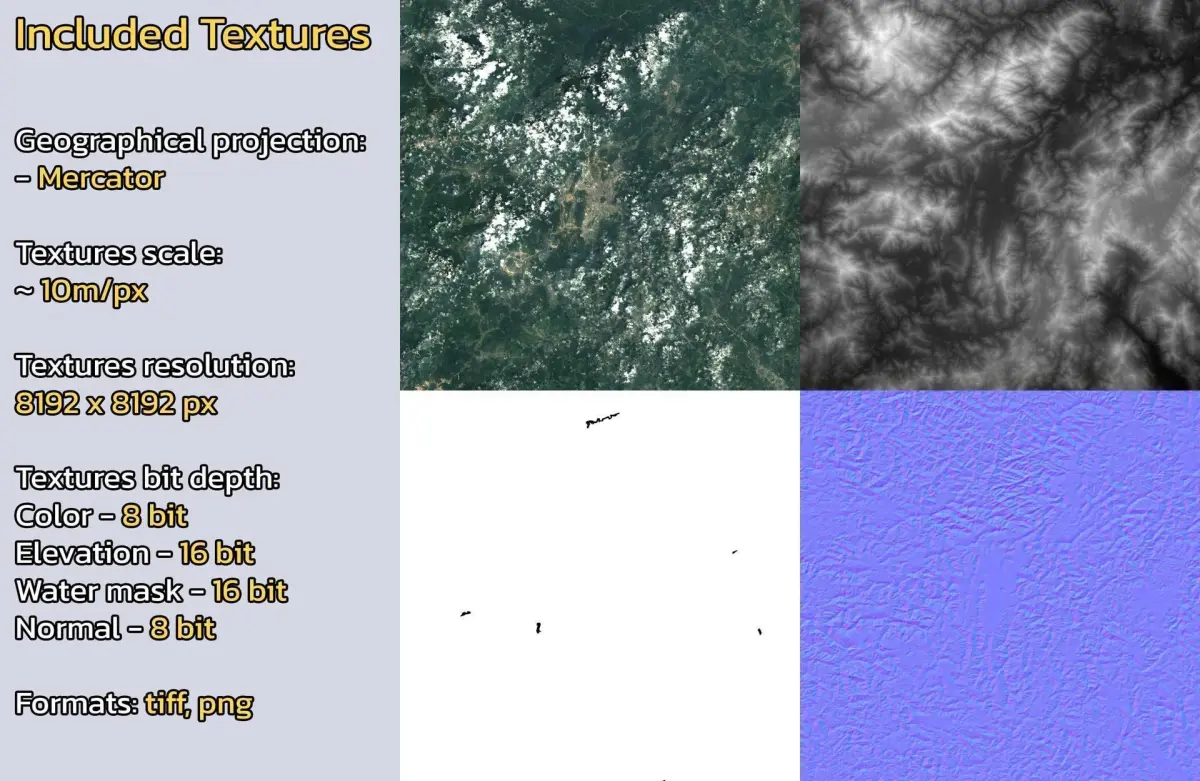 Warning: minor clouds/artifacts may be present on the diffuse color satellite texture due to the nature of the dataset. Check product images.