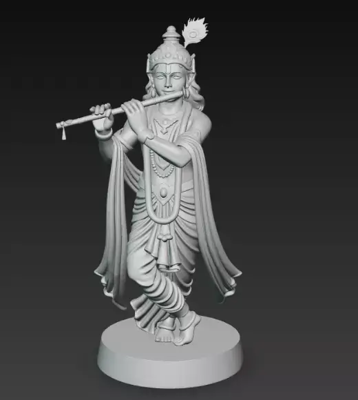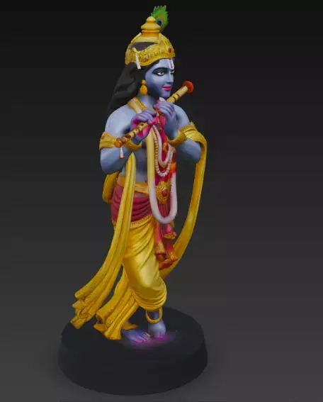 This is a meticulously crafted 3D model of Lord Krishna, designed for 3D printing. The model showcases Krishna in his iconic flute-playing pose, adorned with traditional attire including a golden dhoti, ornate jewelry, and a peacock feather crown. The figure stands gracefully on a black circular base, capturing the divine essence with detailed textures and vibrant colors. Ideal for devotees, collectors, or as a decorative piece, this model is optimized for high-quality printing with a focus on cultural authenticity and artistic precision.