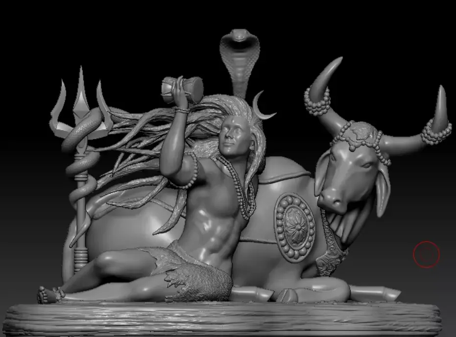 This highly detailed 3D sculpture depicts Lord Shiva, the supreme deity of transformation and meditation, in a serene resting pose beside Nandi, his sacred bull. The model captures intricate details such as Shiva’s flowing hair, crescent moon, Trishul (trident) with entwined serpent, beaded ornaments, and Nandi’s finely sculpted armor and accessories.